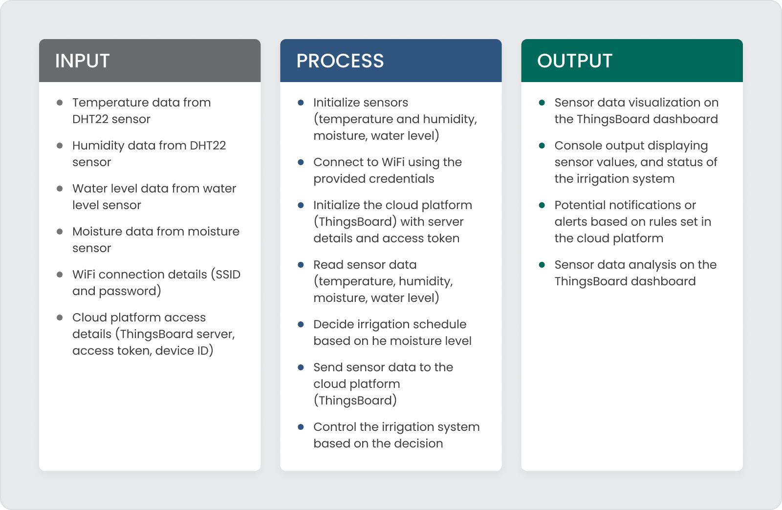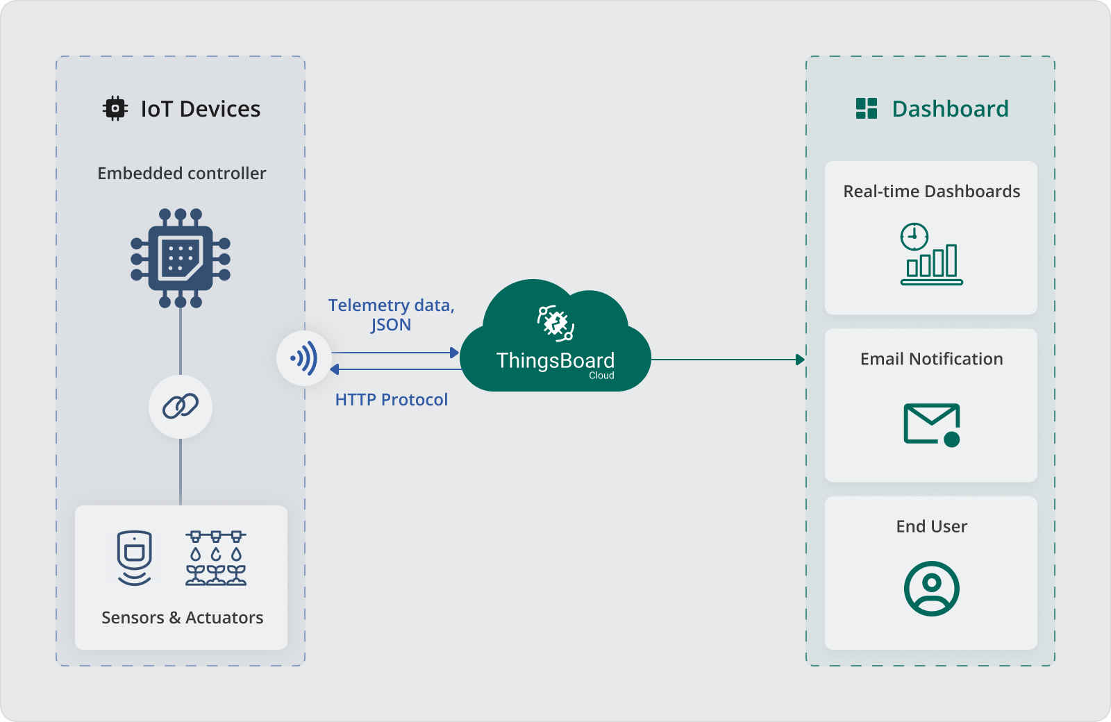 - ThingsBoard 云:这是操作的大脑。 ThingsBoard 管理数据,应用自动化规则(例如当土壤太干时启动灌溉泵),并确保一切顺利进行。