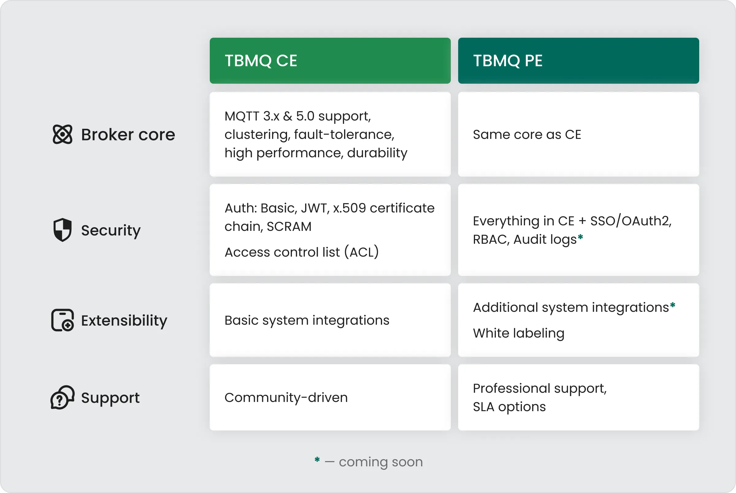 我们很高兴向您介绍 TBMQ专业版 (TBMQ PE) – 我们的 MQTT 代理发展的下一步。 TBMQ PE 构建于 TBMQ 的 经过验证的、可投入生产的核心,并添加了安全性、可观察性、集成和专业支持的高级功能。从这个版本开始,现有的开源版本将被称为 TBMQ 社区版 (TBMQ CE)。
