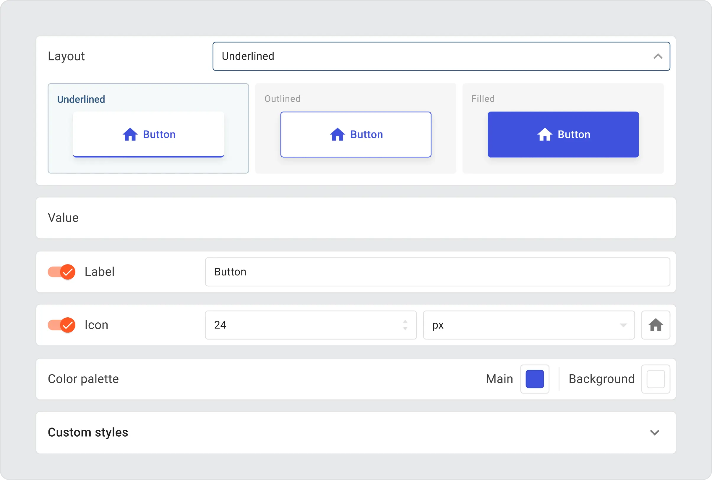 按钮外观是高度可定制的。您可以选择四种可用布局之一,配置图标和标签外观。按钮的颜色通过主调色板和背景调色板进行配置。默认情况下,该按钮使用在 白标设置.
