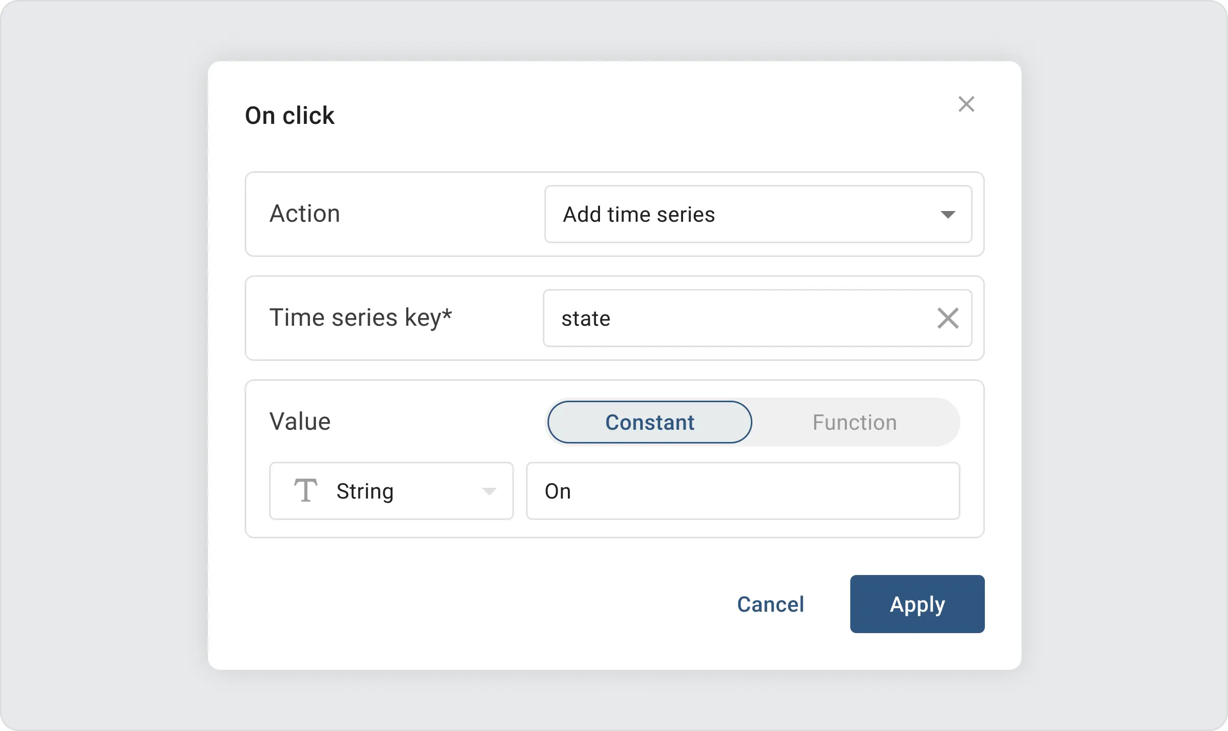 命令按钮小部件旨在执行三个关键操作: 发送 命令 到设备,更新 属性,或附加 时间序列 数据。