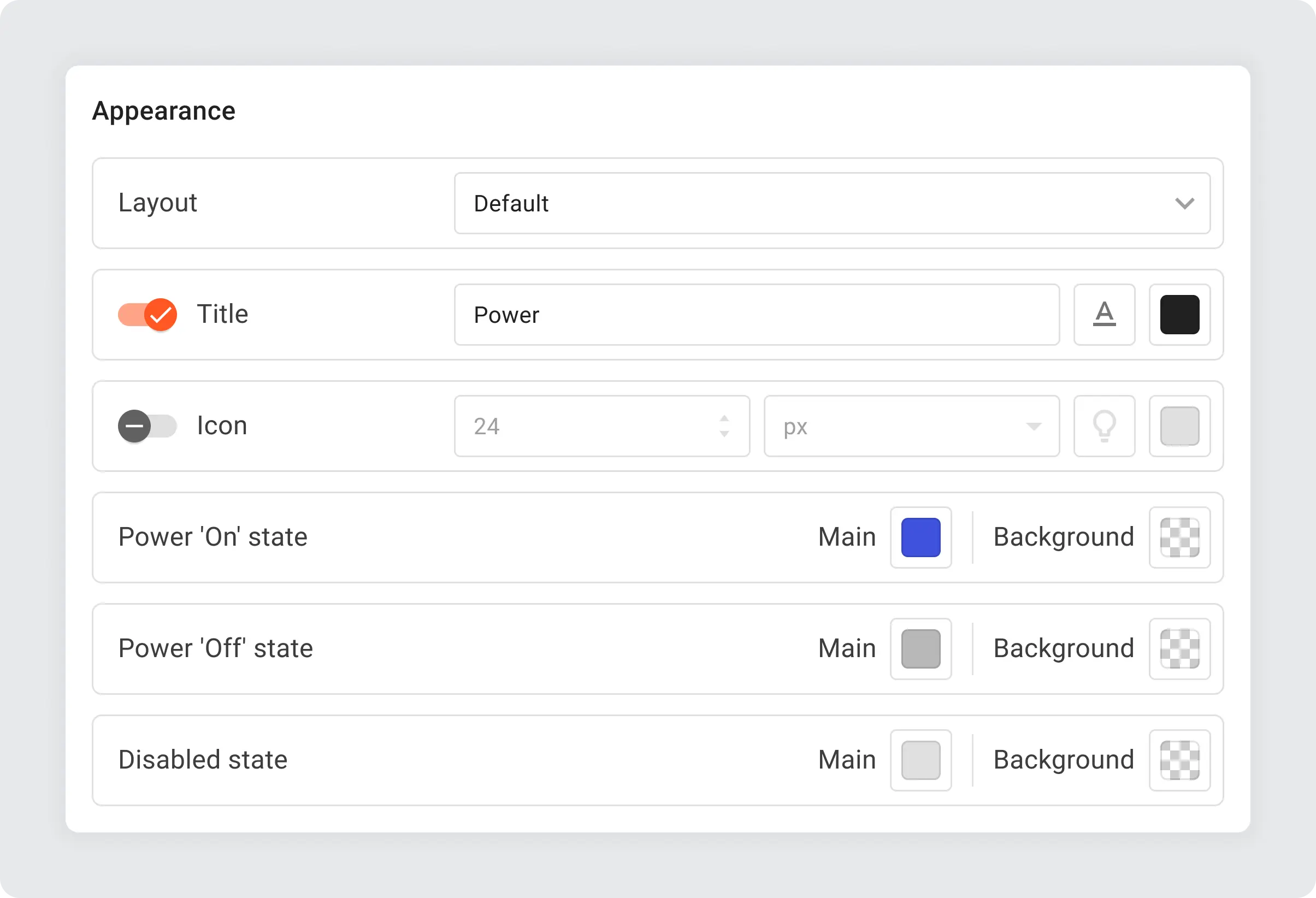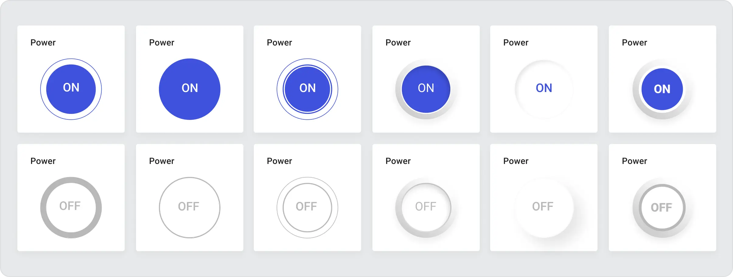 电源按钮小部件与切换按钮类似,外观有所不同,具有“打开”、“关闭”和禁用三种状态,具有六种可自定义布局: