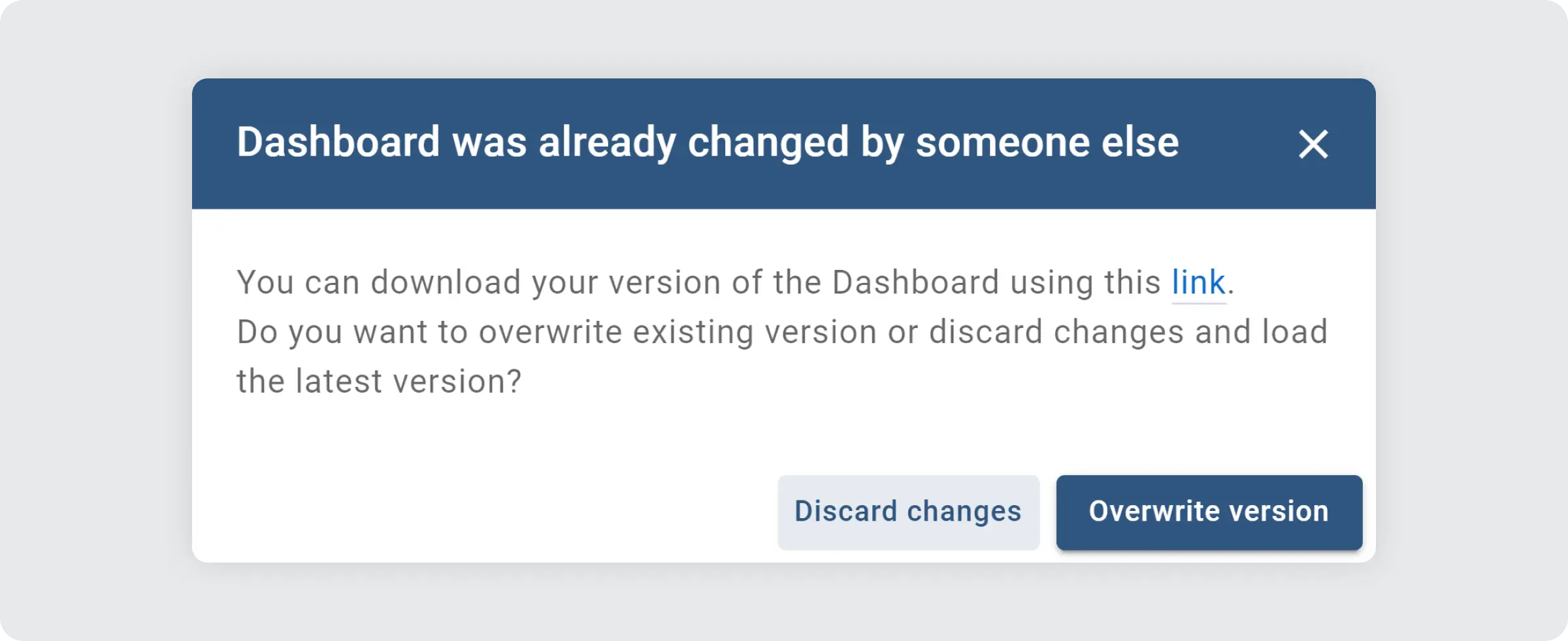 我们引入了一项新功能来管理仪表板上的同步编辑。现在,如果两个或更多用户在同一个仪表板上工作,当其他人已经进行更改时,您会收到通知。那么你可以 覆盖 其他用户的更新 通过您自己的更改或 丢弃 你的修改。但不用担心 - 您仍然可以在放弃更改之前下载最新的仪表板版本,确保保存您的工作而不会丢失任何更新。此功能可改善协作、防止意外数据丢失,并使您能够完全控制更改的管理方式。