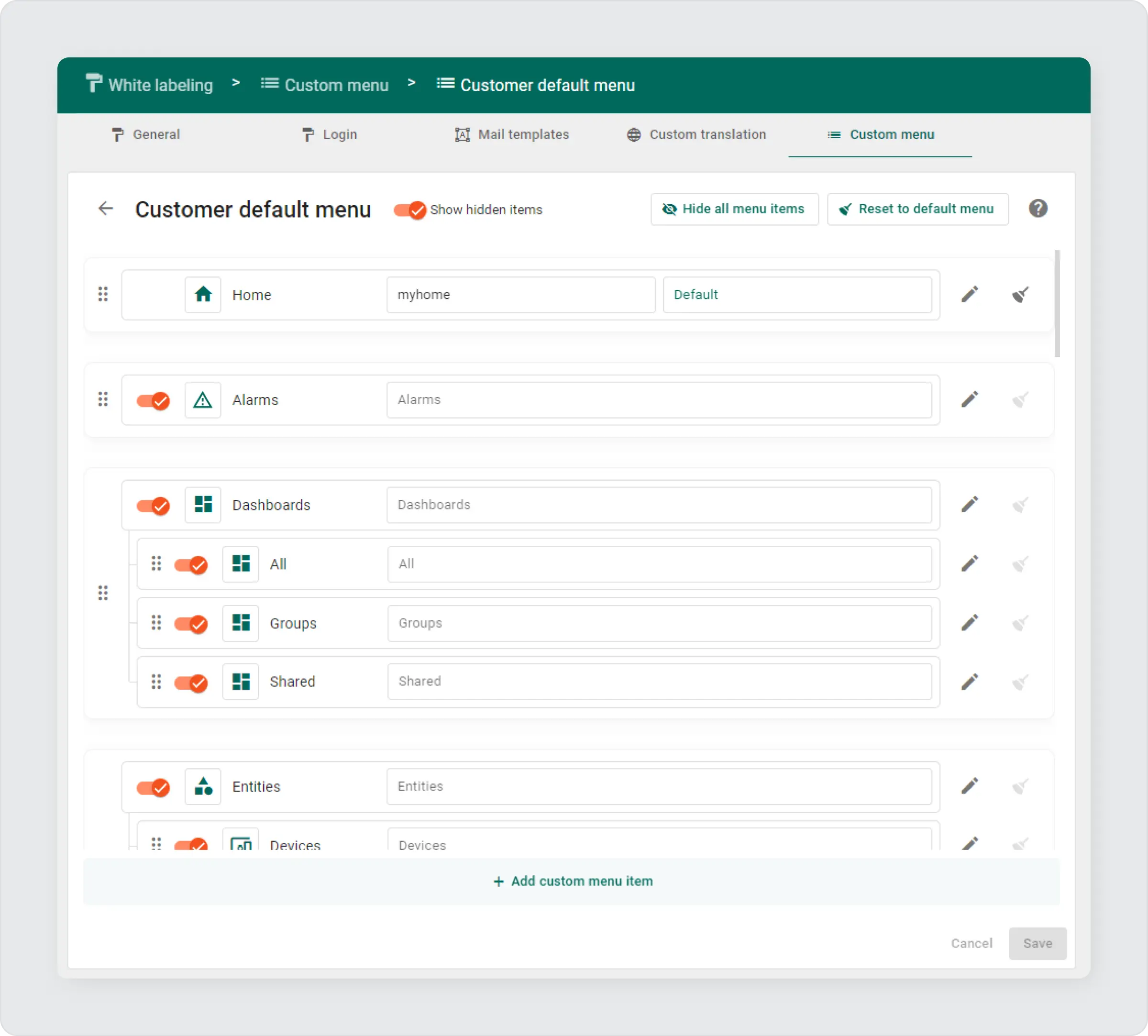 最新的更新使用方便的 Web 表单而不是纯 JSON 简化了添加和编辑菜单项的过程。我们增强了现有功能的用户体验,并引入了新功能以实现更灵活的定制。现在,您可以为不同范围创建自定义菜单(系统, 租户, 顾客)并将每个菜单分配给特定的 顾客或者用户 列表。此外,新的自定义菜单配置允许您排列各部分的顺序和内容,以及只需单击几下即可添加自定义图标。