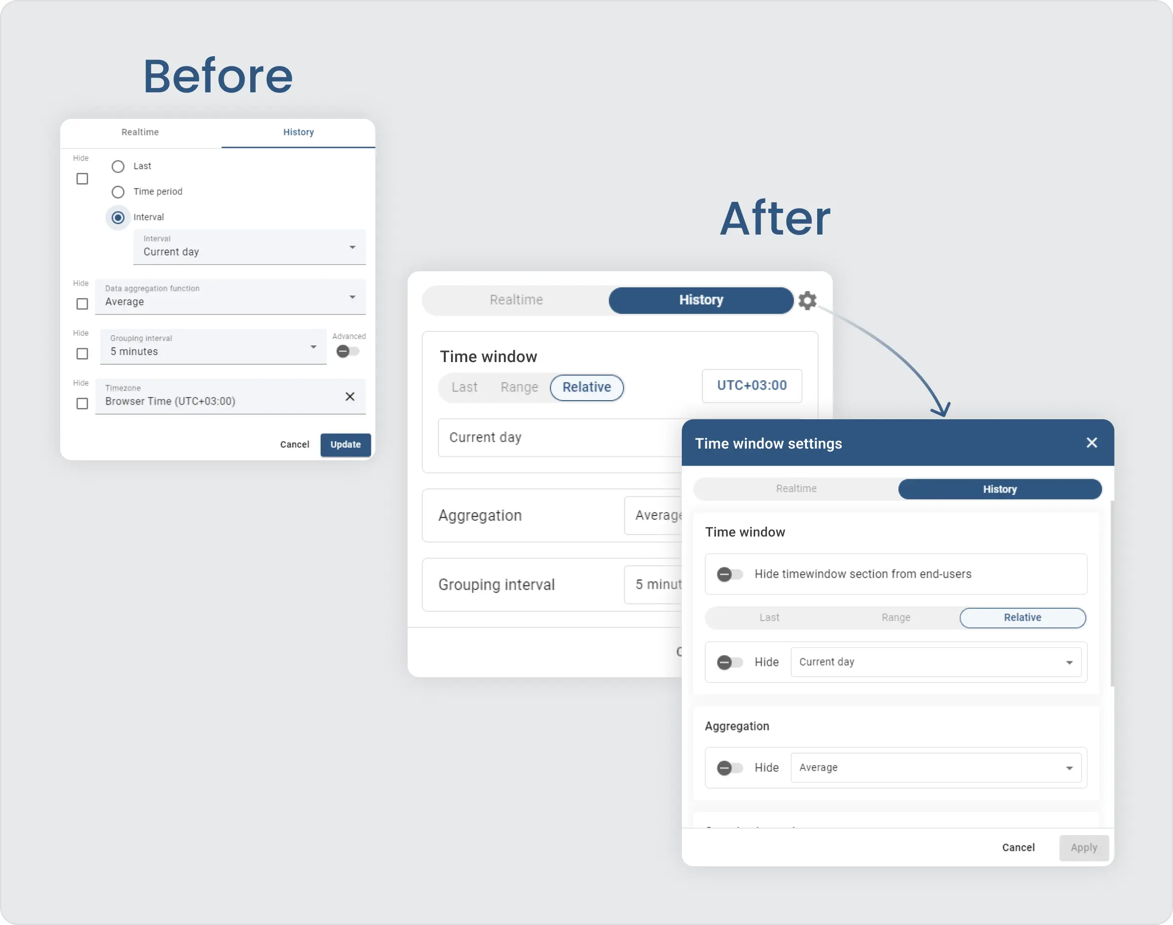 在此更新中,我们增强了时间窗口组件的外观。此外,“历史记录”选项卡的可见性设置已扩展,因此您现在可以隐藏 最后的, 范围, 或者相对的 部分分开。