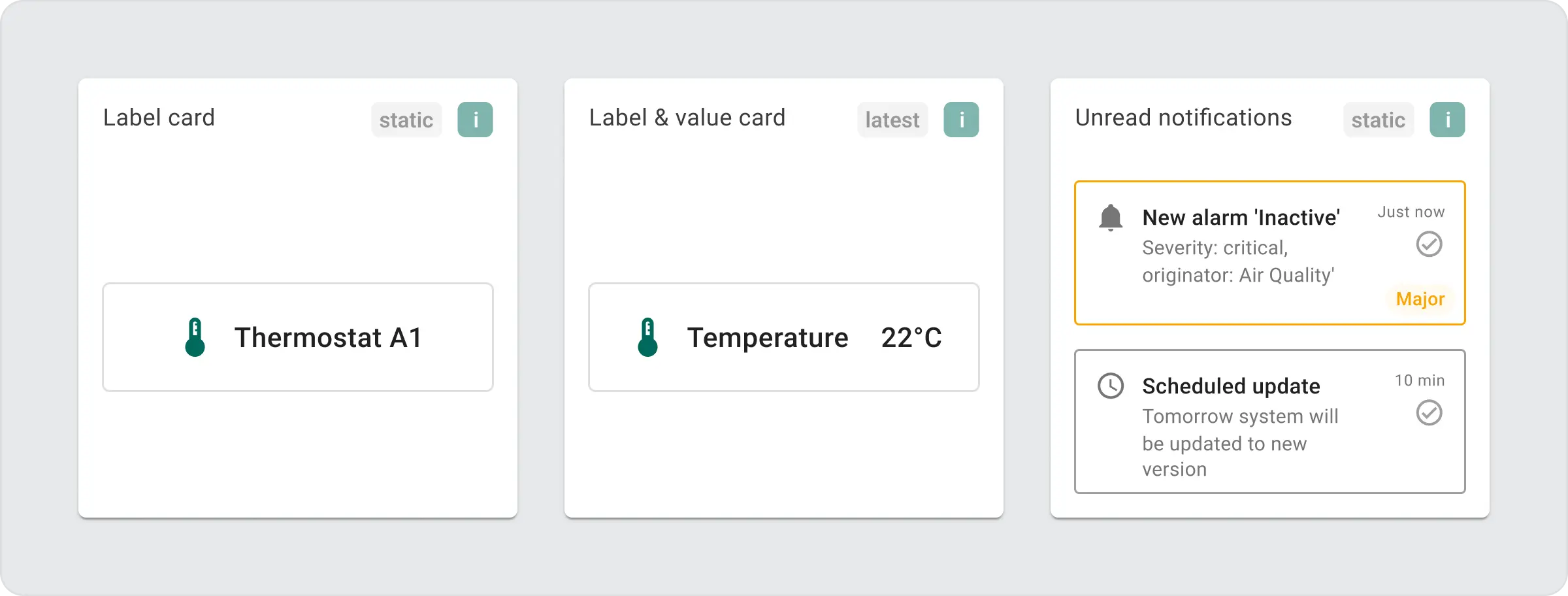 我们通过新的卡片小部件改进了我们的平台: 标签卡 用于添加自定义静态标签和 标签和储值卡 用于时间序列数据或属性的可视化。此外,我们还推出了一个新的 未读通知小部件,它可以方便地立即在仪表板上显示所有通知。当您想要在一页上显示所有数据或仅从仪表板的全屏模式使用 ThingsBoard 平台时,这会派上用场。