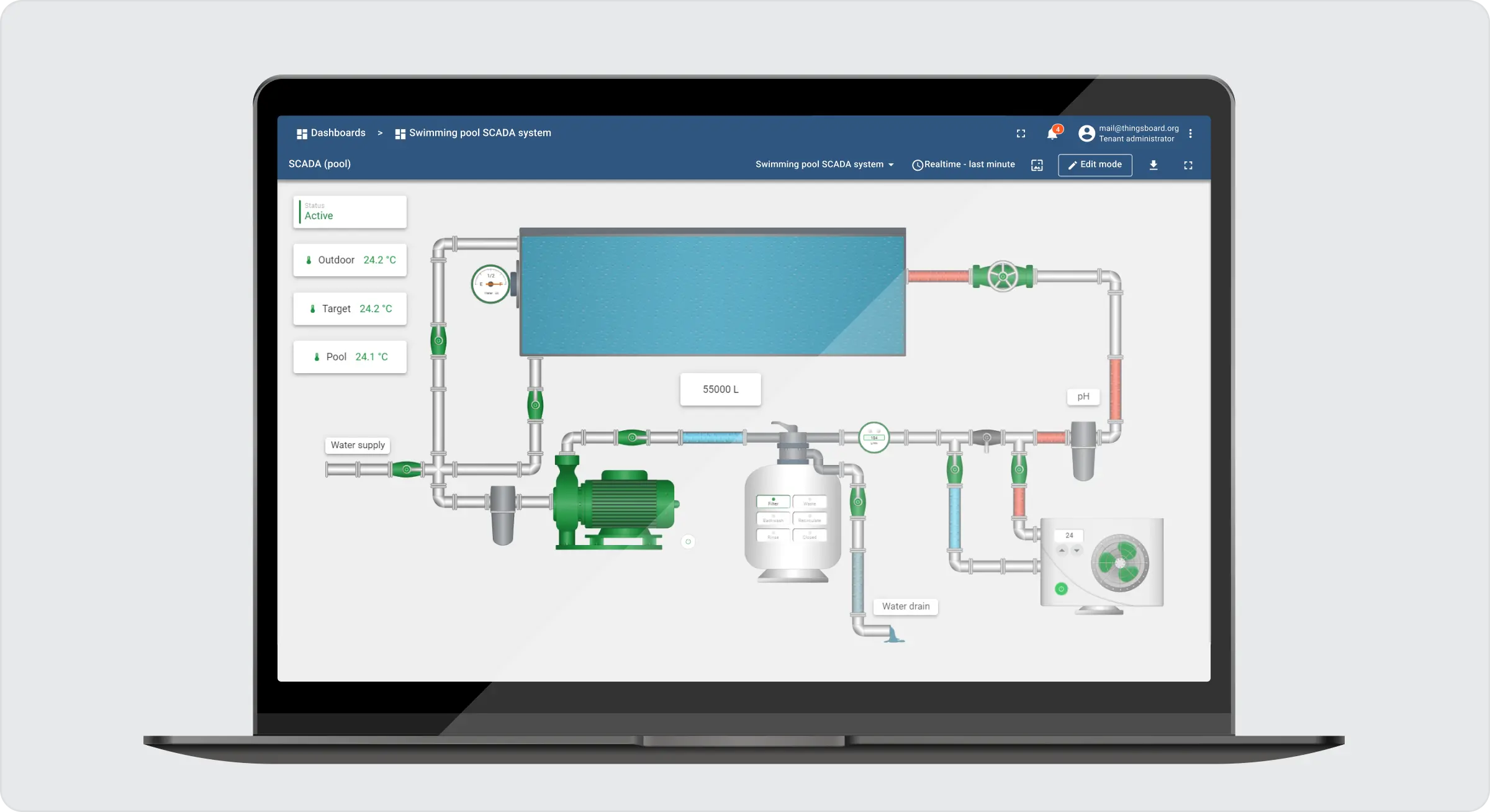 A SCADA dashboard within ThingsBoard offers all the typical platform dashboard functionalities with a specialized SCADA layout designed to ease the creation of SCADA HMIs (Human-Machine Interfaces). It typically includes unique scalable widgets called SCADA符号。每个符号都可以代表物理对象的状态,例如阀门、泵、电机、水箱或管道。在 ThingsBoard 上,这些符号基于 SVG(可扩展矢量图形)文件,确保它们无缝调整到任何屏幕尺寸。在此更新中,我们还引入了轻松地 创建您的自定义符号 使用 SVG 文件。