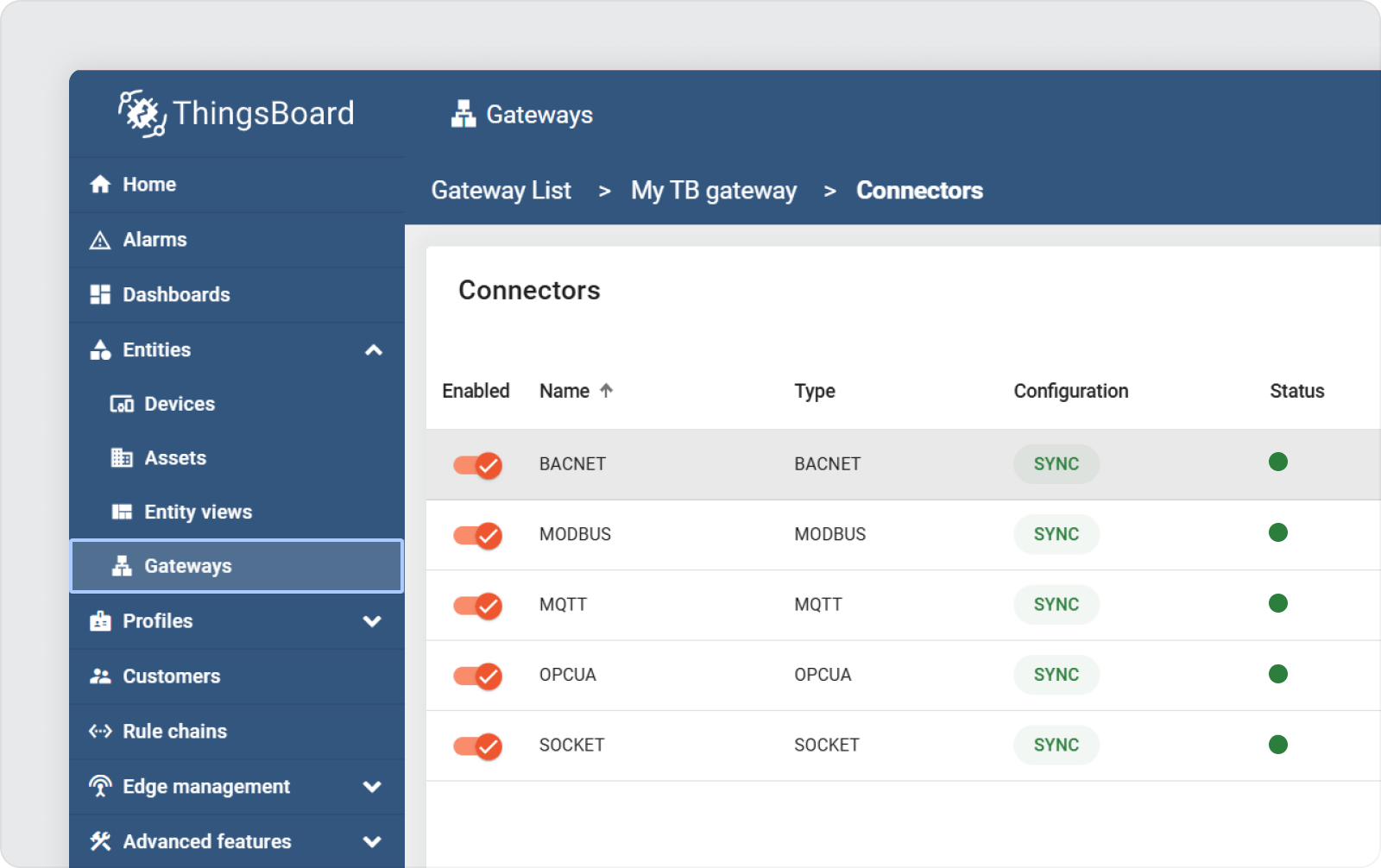 ThingsBoard 网关管理仪表板已重新定位到实体部分下的专用菜单项。这使我们能够独立于核心 ThingsBoard 发布周期更新网关管理仪表板,确保用户始终能够访问最新功能、错误修复和优化。如果您的 ThingsBoard 实例连接到互联网,仪表板更新将自动应用。