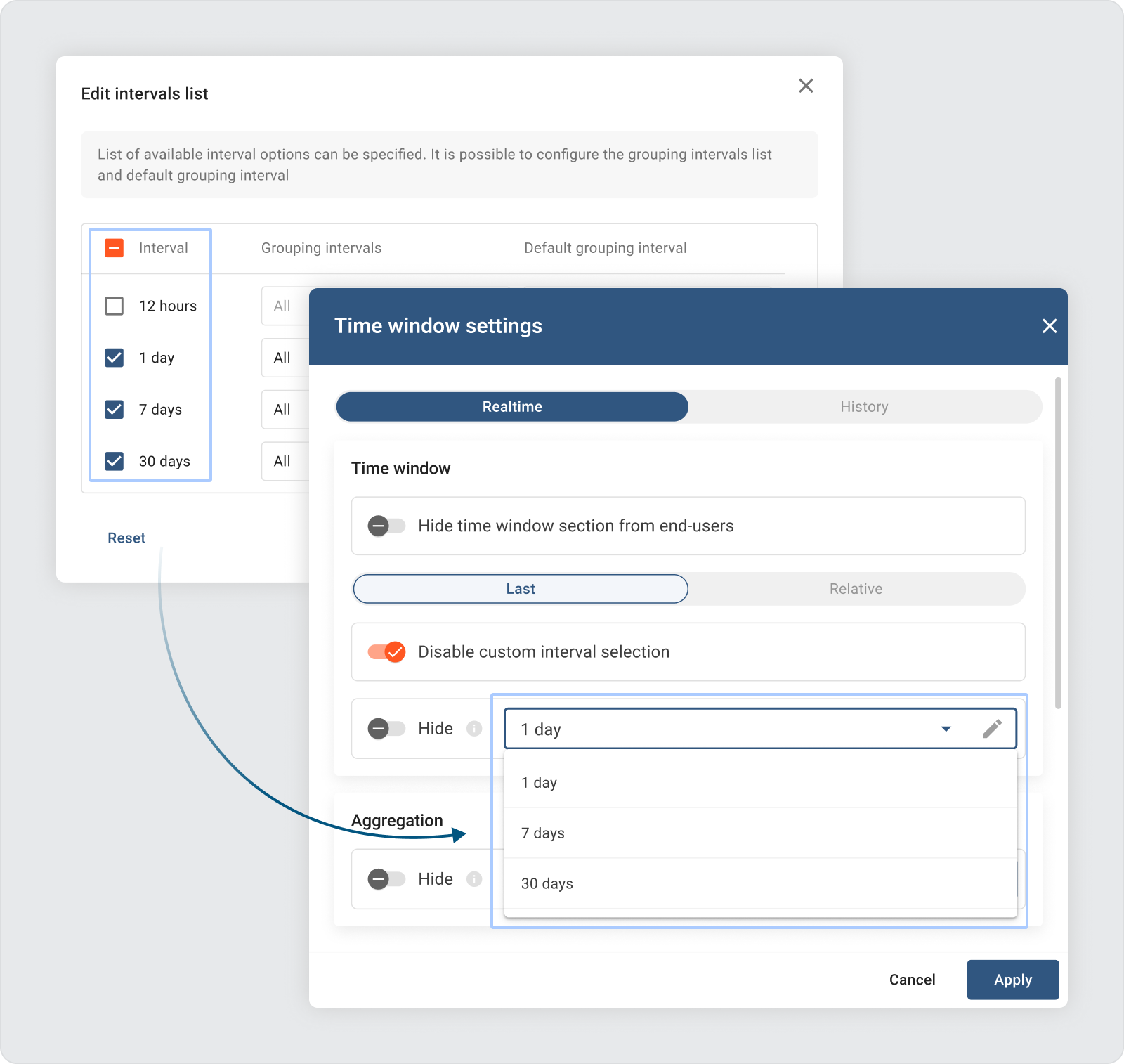 我们增强了时间窗口功能,为仪表板开发人员提供了更大的控制权。您现在可以限制可见 时间间隔, 聚合函数, 和分组间隔 可供仪表板最终用户使用。此更新可确保更精确地控制最终用户可以访问的时间窗口设置。