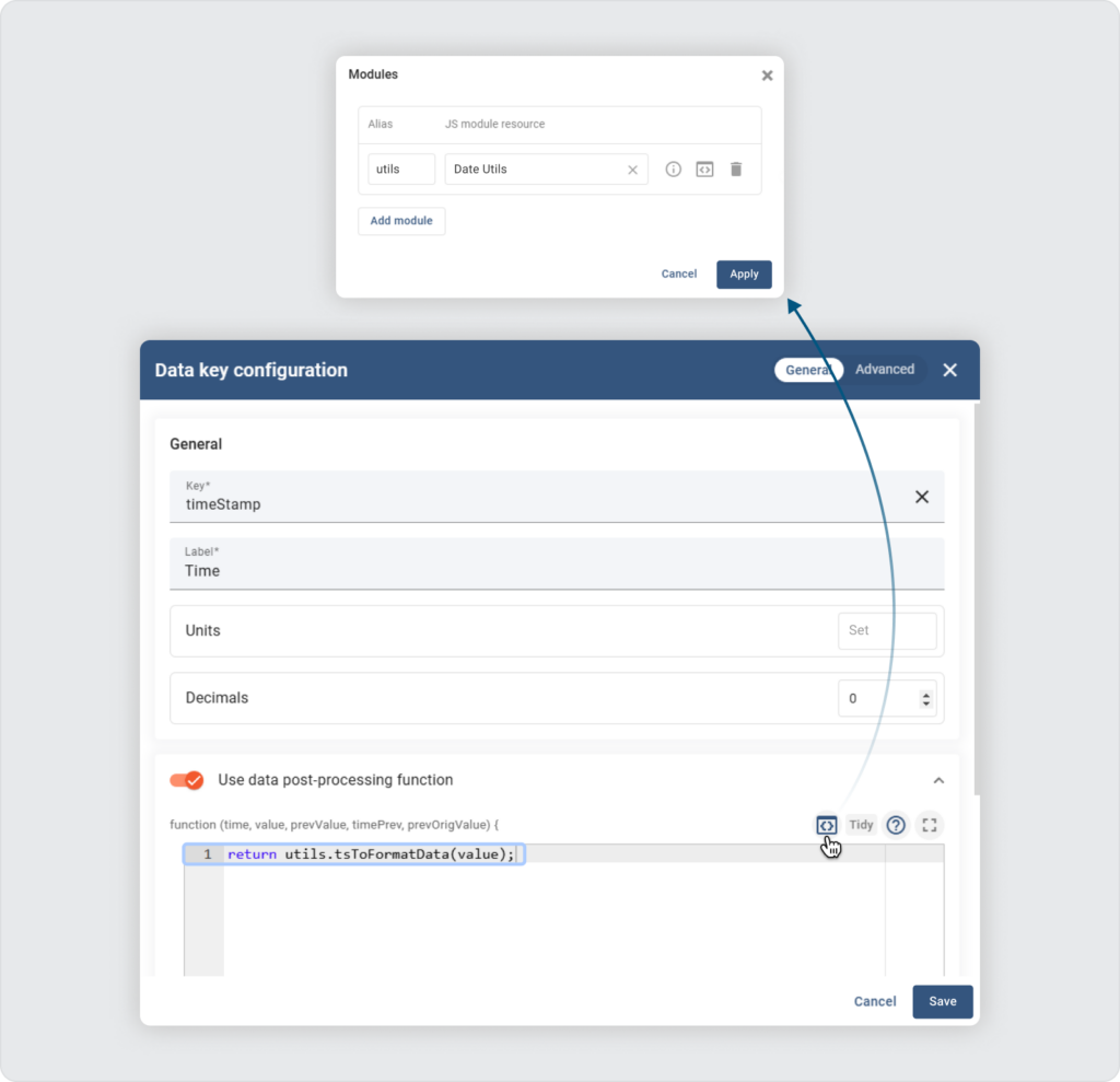 添加模块类型 JavaScript 资源后,您可以在平台内的任何 JavaScript 编辑器中重用此代码,例如数据后处理函数、单元格内容函数和自定义操作。为此,只需单击“模块”图标,选择您的 JS 模块,提供别名,然后在 JavaScript 编辑器中使用此别名来引用您的模块。下面是一个简单的例子: