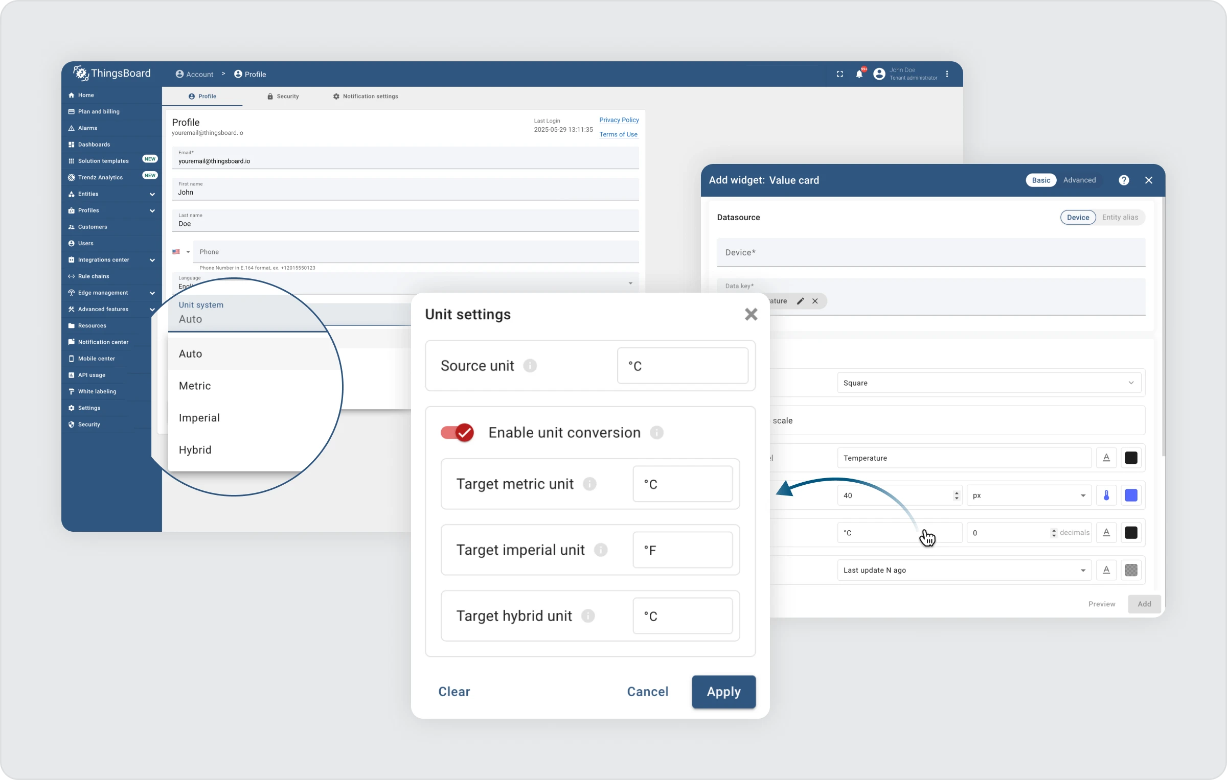 忘记手动转换和重复的小部件!从版本 4.1 开始,ThingsBoard 自动在公制和英制单位之间转换数据。无论是摄氏度还是华氏度、公里还是英里——设置一次,就可以在任何地方使用。