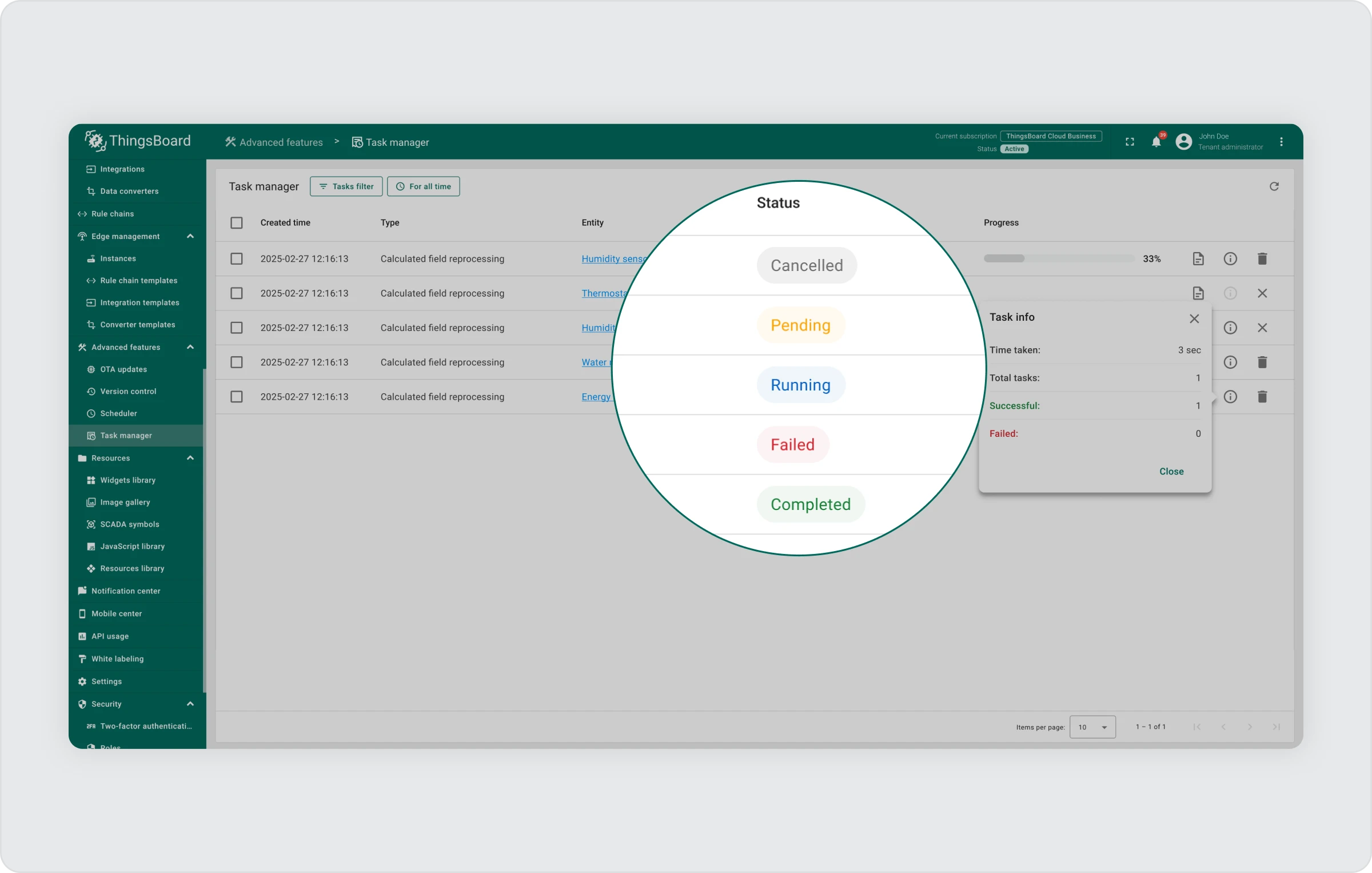 ThingsBoard 4.1 引入了 任务管理器 — 用于从 UI 跟踪和管理后台任务的集中式工具。第一个支持的任务是 字段计算重新处理。触发后,将创建一个主任务并将其拆分为每个实体的子任务。