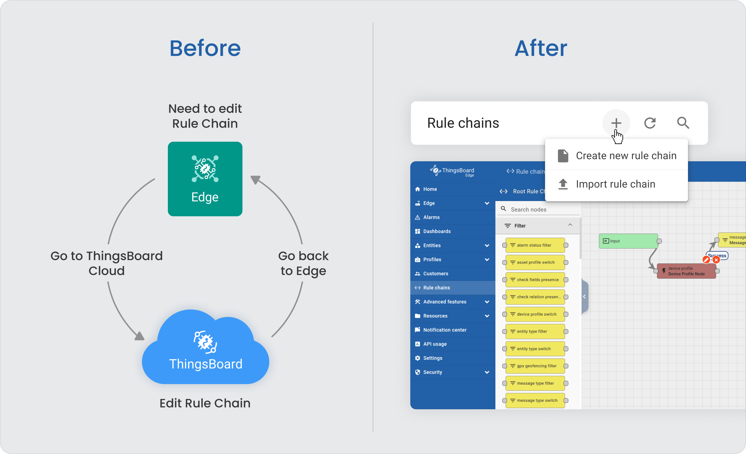 想象一下您的团队在现场,在偏远地区部署设备。您需要实时敏捷性来使规则逻辑适应新的传感器行为,而无需通过云。过去,您必须浏览服务器 UI 并同步更改。现在?您只需打开 Edge UI 并修改规则链即可!