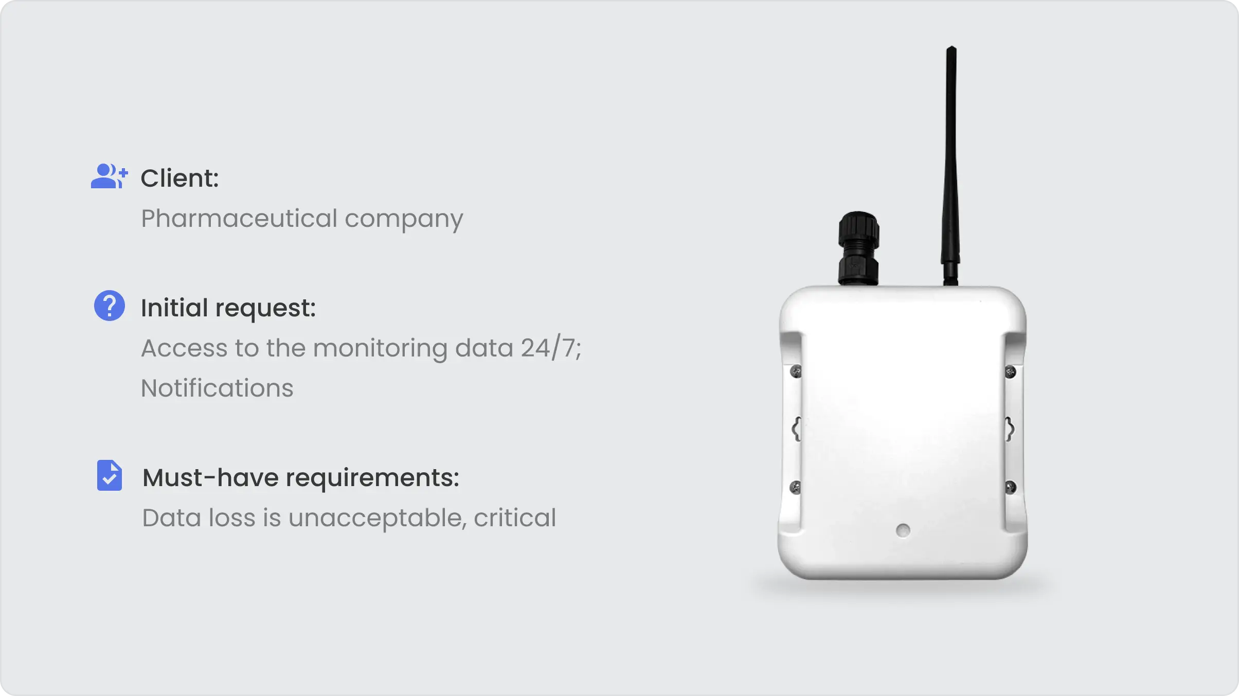 客户的主要担忧是数据丢失。当时的设备很容易因网络或电源故障等各种问题而断开连接,从而导致遥测传输或记录失败。此外,系统缺乏通知客户端这些中断的机制。此外,没有提供远程访问监控数据的措施。