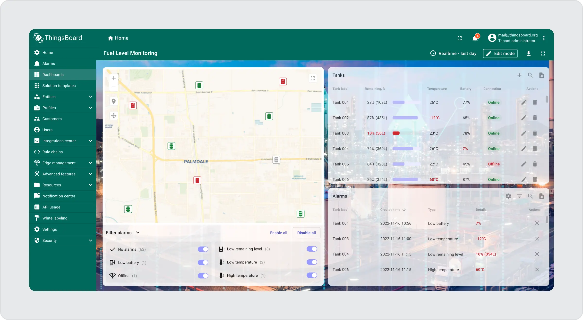 ThingsBoard 储罐液位监测解决方案 提供对油位的实时洞察,促进石油库存的主动管理和炼油操作工作流程。该解决方案采用先进技术,包括适应性强的传感器和强大的通信协议,以准确跟踪油箱油位。借助直观的仪表板,用户可以轻松监控油箱状态、配置测量详细信息和自定义警报,并跟踪油消耗量。掌握石油管理流程可以减少运营中断并确保持续的燃料可用性,从而简化运营并提高客户满意度。