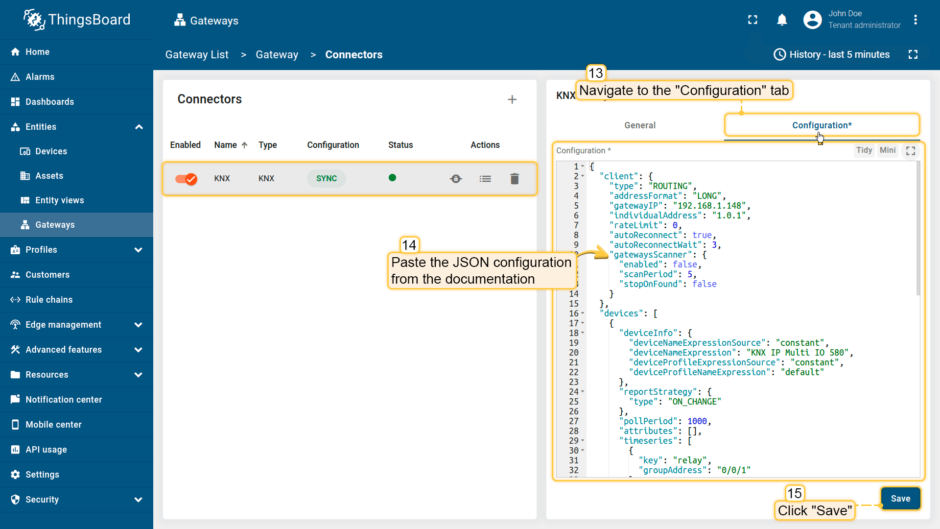 通过本指南,您可以轻松将KNX IP Multi IO 580控制器与开关、百叶窗和继电器连接到ThingsBoard。将设备连接到网关后,您就可以在ThingsBoard上查看和处理设备发送的数据。