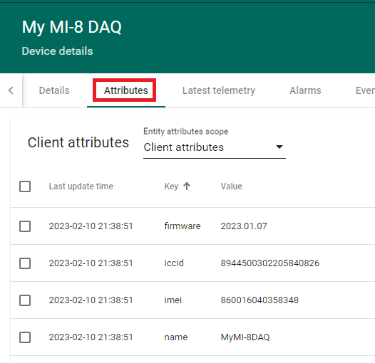 属性是MI-8发送至ThingsBoard的附加数据,通常相对固定,例如调制解调器IMEI、SIM卡ID(ICCID)及MI-8固件版本。