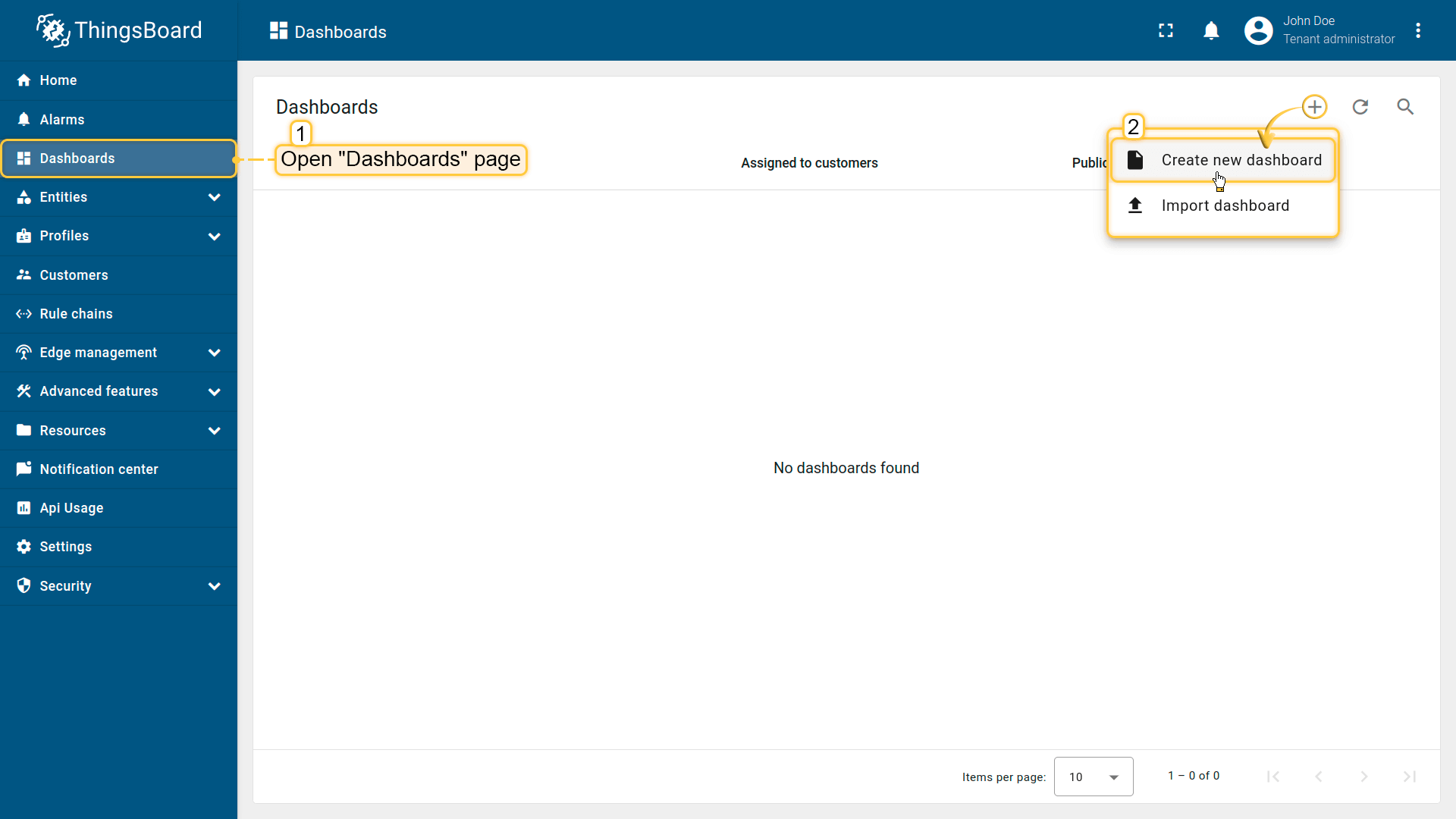 进一步了解可查阅ThingsBoard文档, 学习创建仪表板可视化遥测、 配置告警规则实时监控设备行为等核心功能。