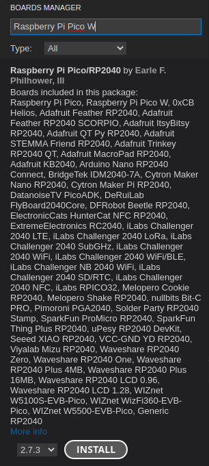 进入 工具 > 开发板 > 开发板管理器 并安装 Raspberry Pi Pico/RP2040 by Earle F. Philhower 开发板。