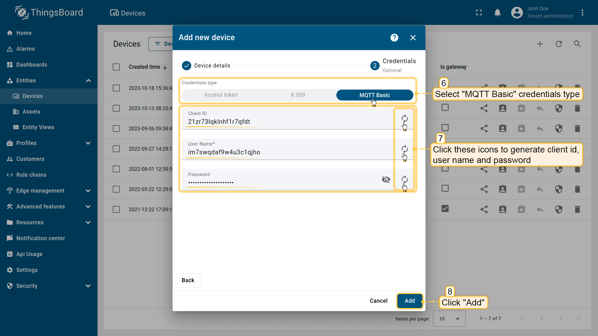 Click on “Credentials” tab. Check “Add credentials” and select “MQTT Basic” credentials type. Click on “Generate” button on each field and click “Add” button;