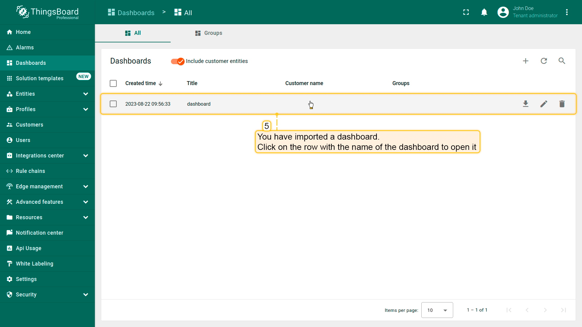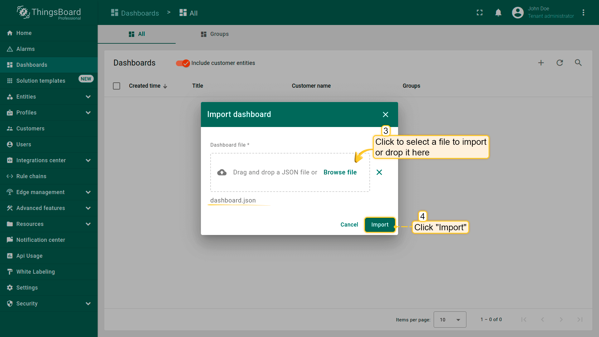 将仪表板添加到ThingsBoard需要导入。请按以下步骤操作: