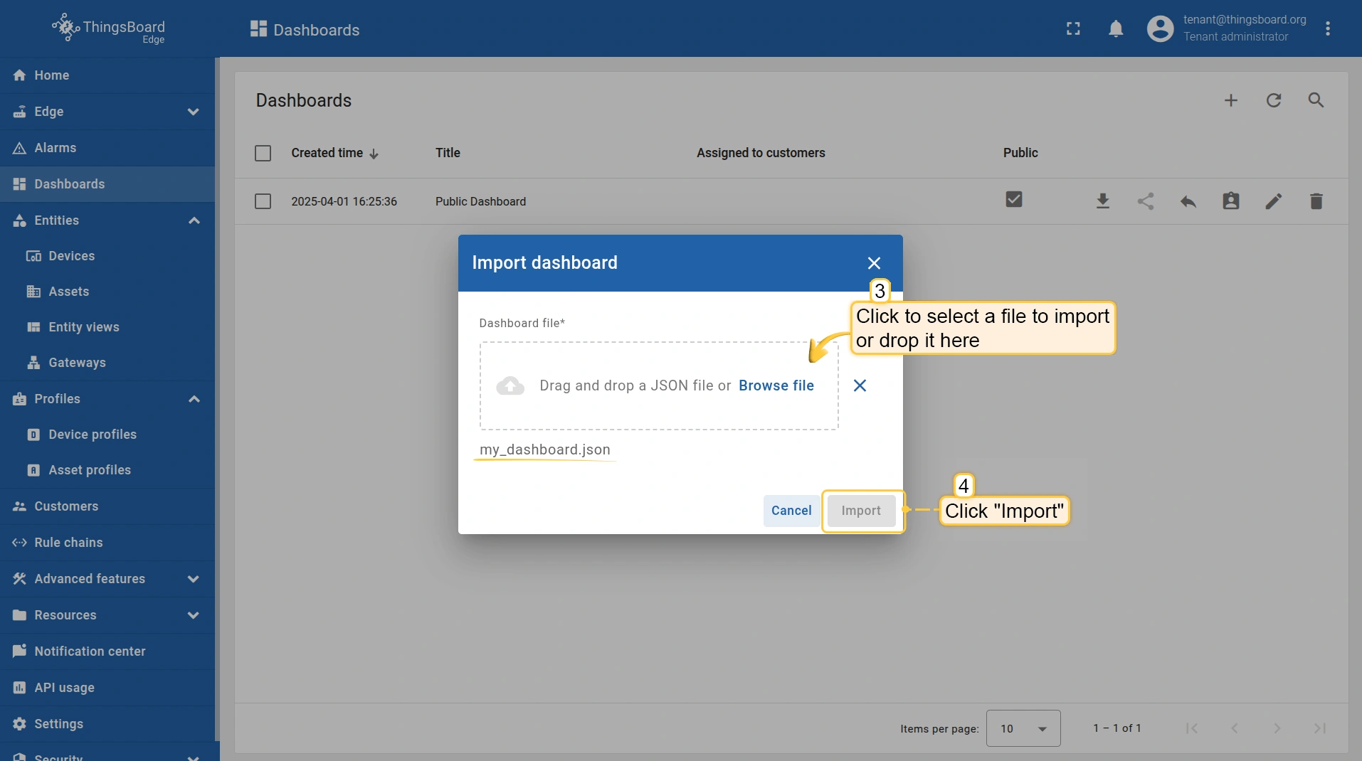 导入仪表盘您可导入 JSON 格式的仪表盘。要导入仪表盘,请进入「仪表盘」组,点击页面右上角的 「+」 按钮,选择 「导入仪表盘」。仪表盘导入窗口将弹出,系统会提示您上传 JSON 文件并点击 「导入」。 下方可找到仪表盘 JSON 文件: 导入后,我们需要为设备选择实体别名。 操作方式:点击铅笔图标并选择实体别名,选择别名「My device」并点击铅笔图标打开编辑。 然后,从下拉列表中选择名为 My device 的设备并保存实体别名。完成后即可查看设备数据。 若操作正确,您将看到以下仪表盘: