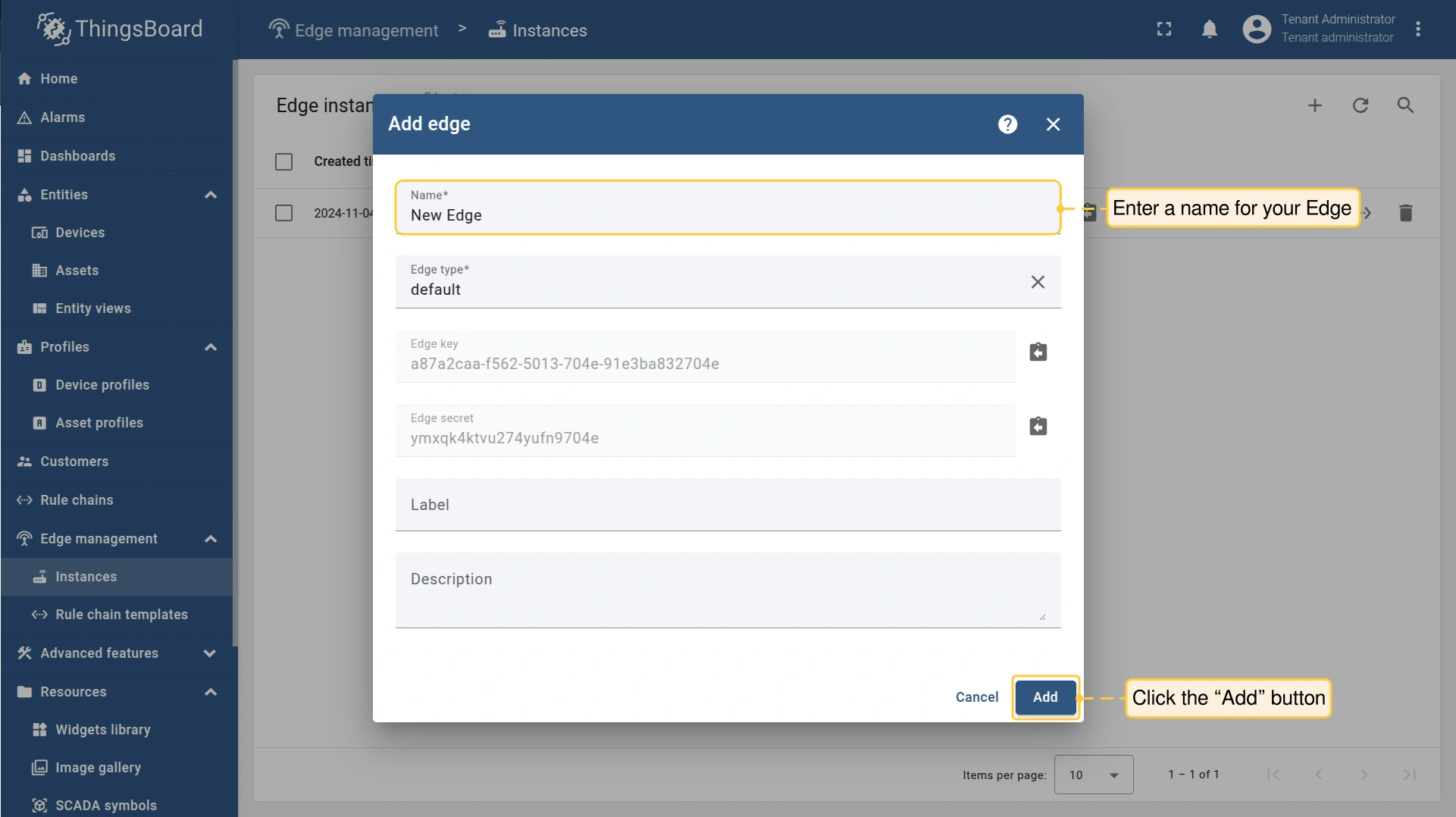 在 “Name” 字段输入Edge名称,点击 “Add” 按钮确认添加新Edge。