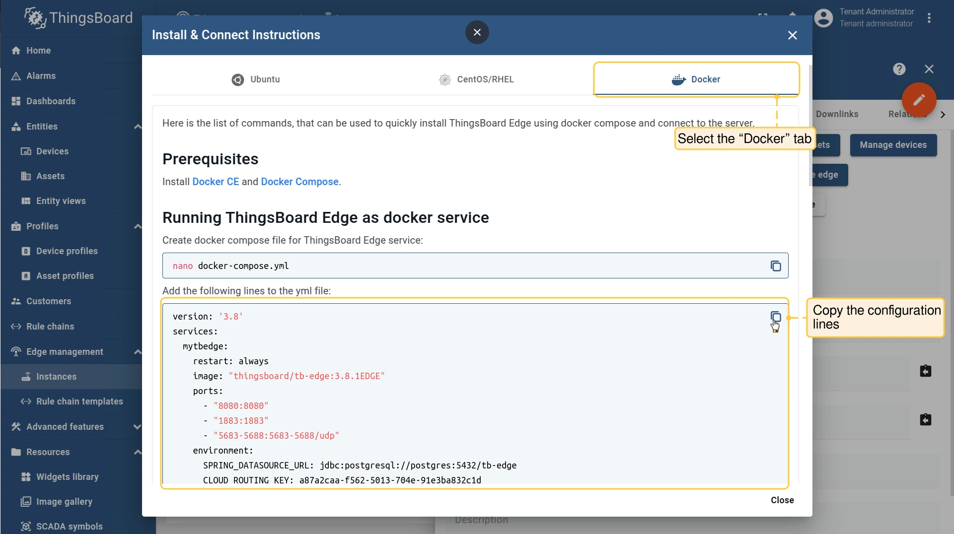 进入 ThingsBoard Community Edition 实例的 Edge management > Instances 部分,点击 Instance。然后点击 「Install & Connect Instructions」 按钮。