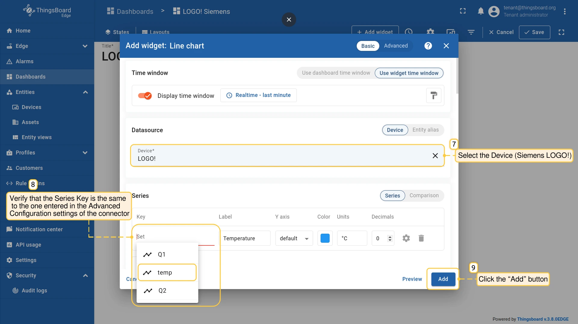 在 “添加部件” 弹出窗口中,将 数据源 选为 设备(本例为Siemens LOGO!)。请确认 序列键 与连接器 高级配置 中填写的一致,例如使用 “temp” 时,序列键也需为 “temp”。点击 “添加”。