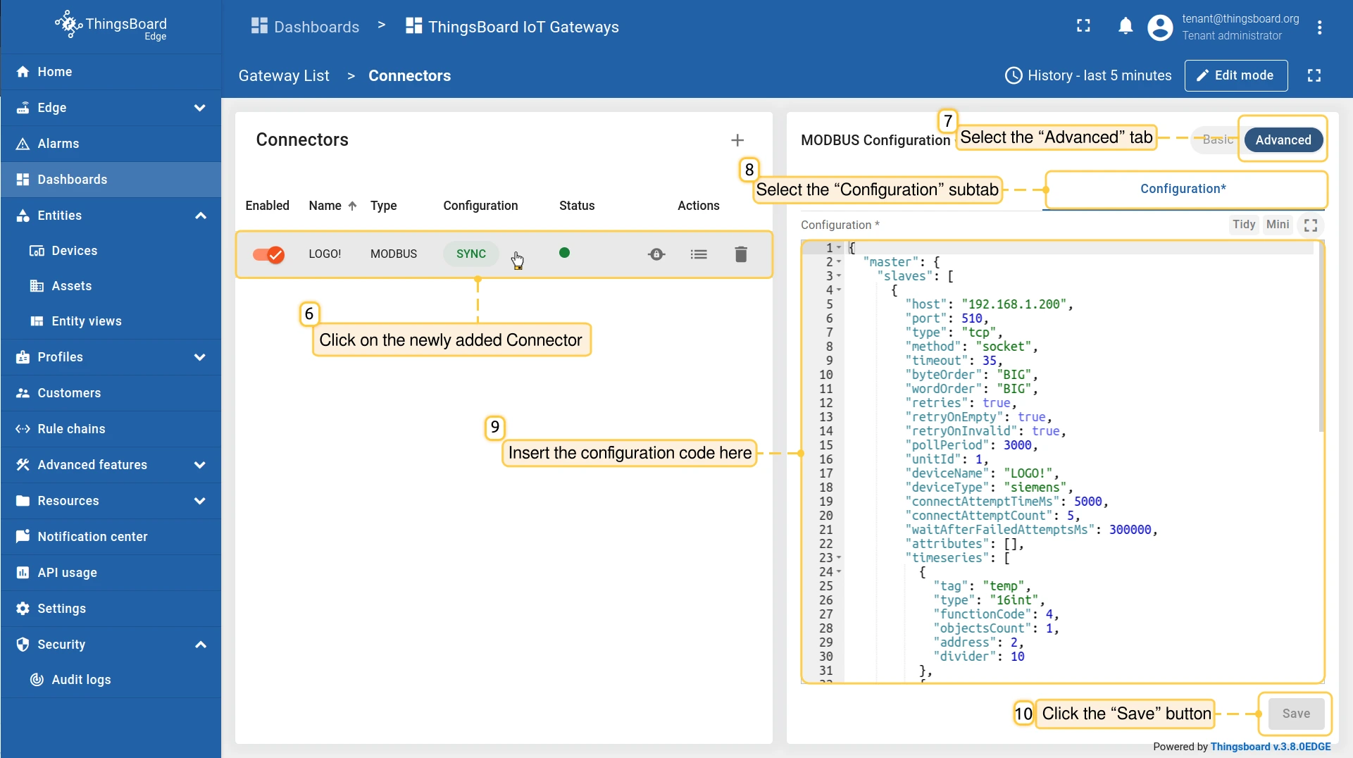 新的 IoT网关设备 将显示在 “ThingsBoard IoT网关” 仪表板列表顶部,便于我们添加 ModBus连接器。例如,可使用ModBus连接器从 Siemens LOGO! 设备获取温度数据: