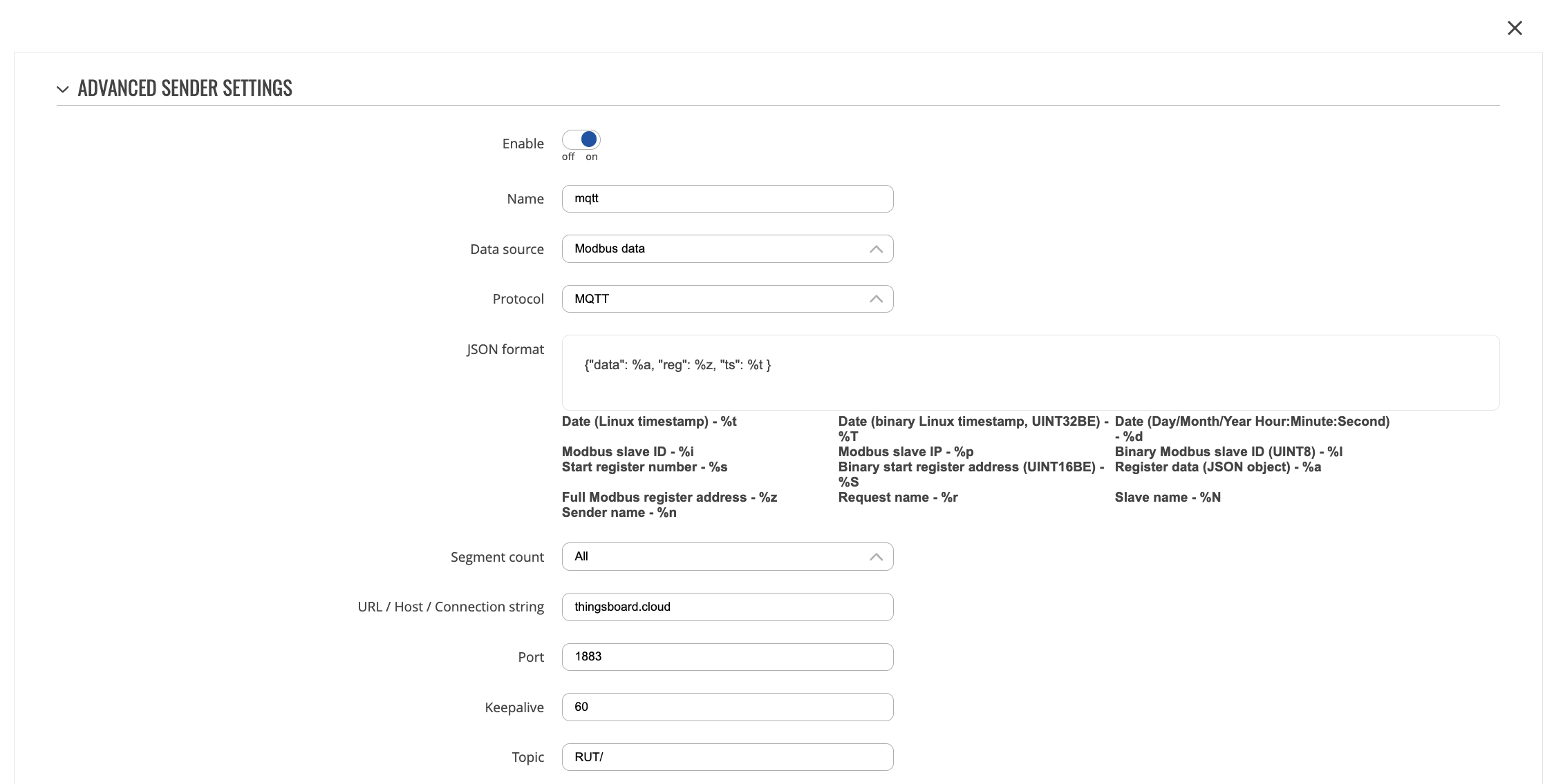 • Click on “Transport configuration” tab. Select MQTT transport type and change Telemetry topic filter value from “v1/devices/me/telemetry” to “RUT/”. Click on “Add” button;
