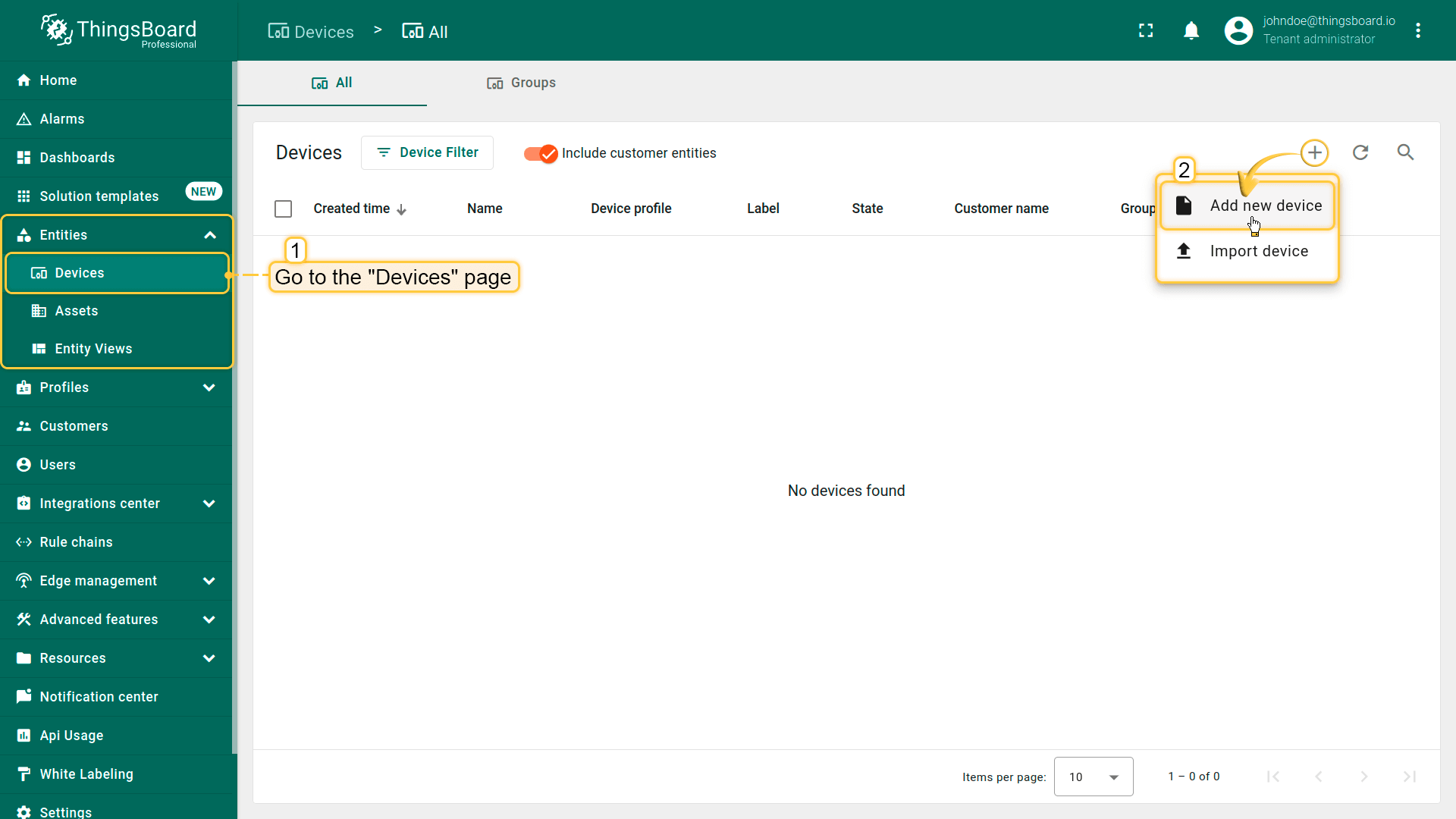 • Open the Devices page. By default, you navigate to the device group “All”. Click on the “+” icon in the top right corner of the table and then select “Add new device”;