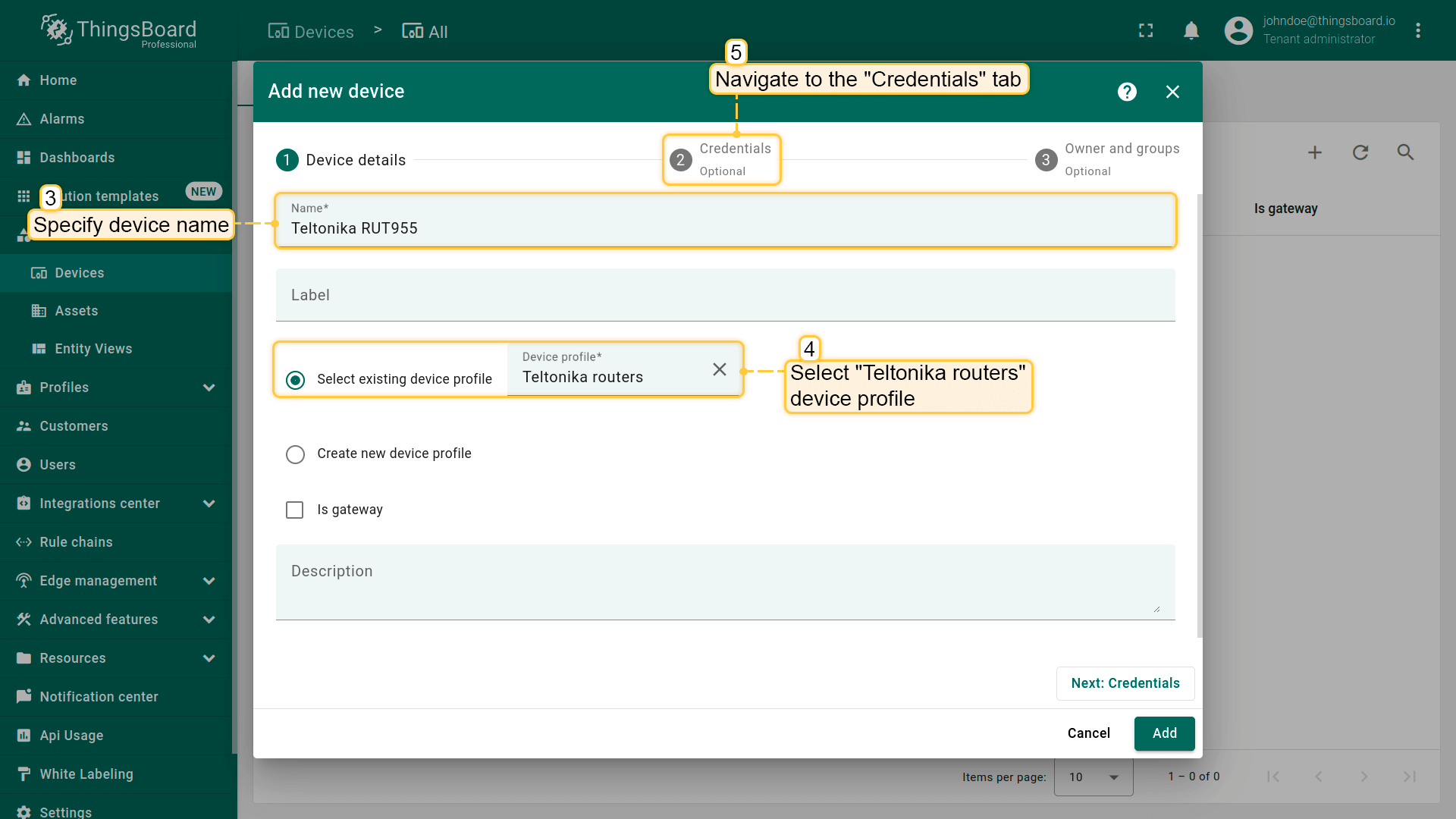 • Input device name. For example, “Teltonika RUT955”. Select created device profile from the step above, in our case “Teltonika routers”;