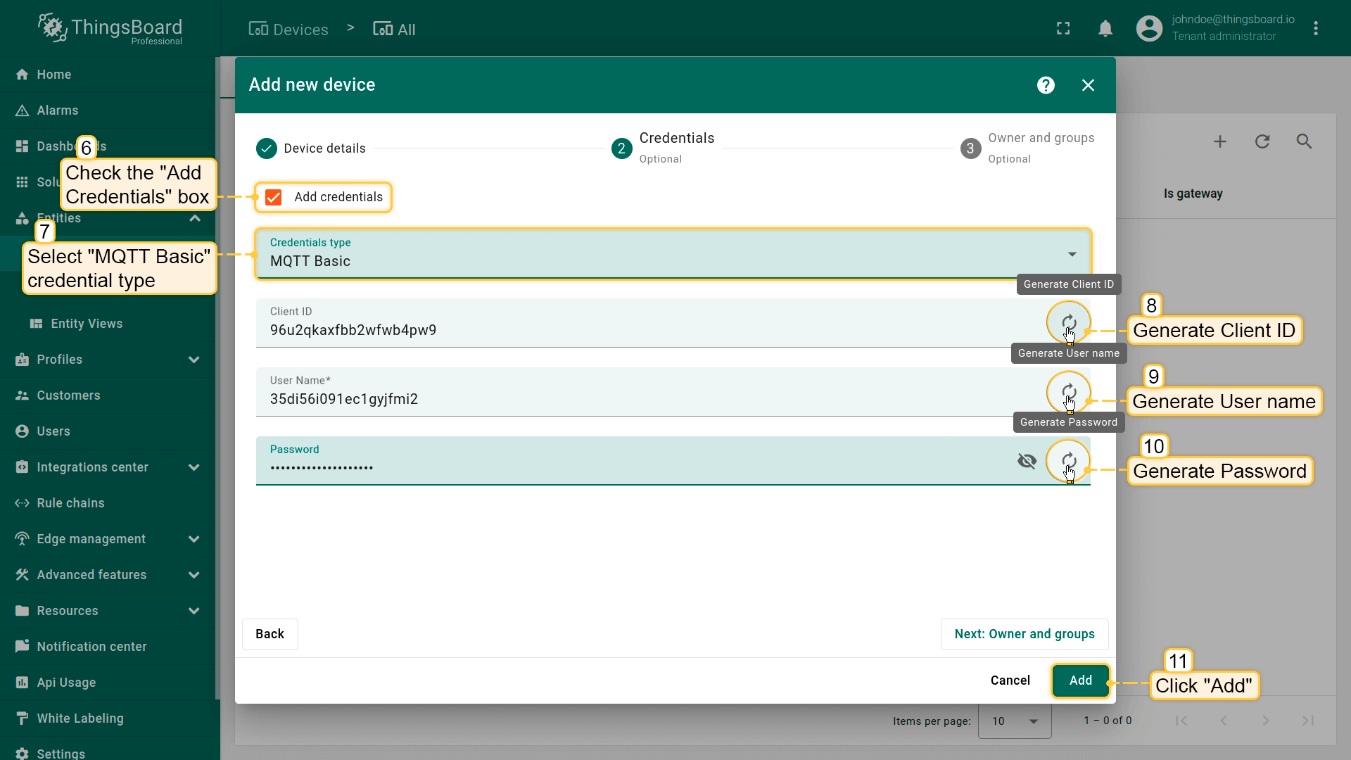 • Click on “Credentials” tab. Check “Add credentials” and select “MQTT Basic” credentials type. Click on “Generate” button on each field and click “Add” button;