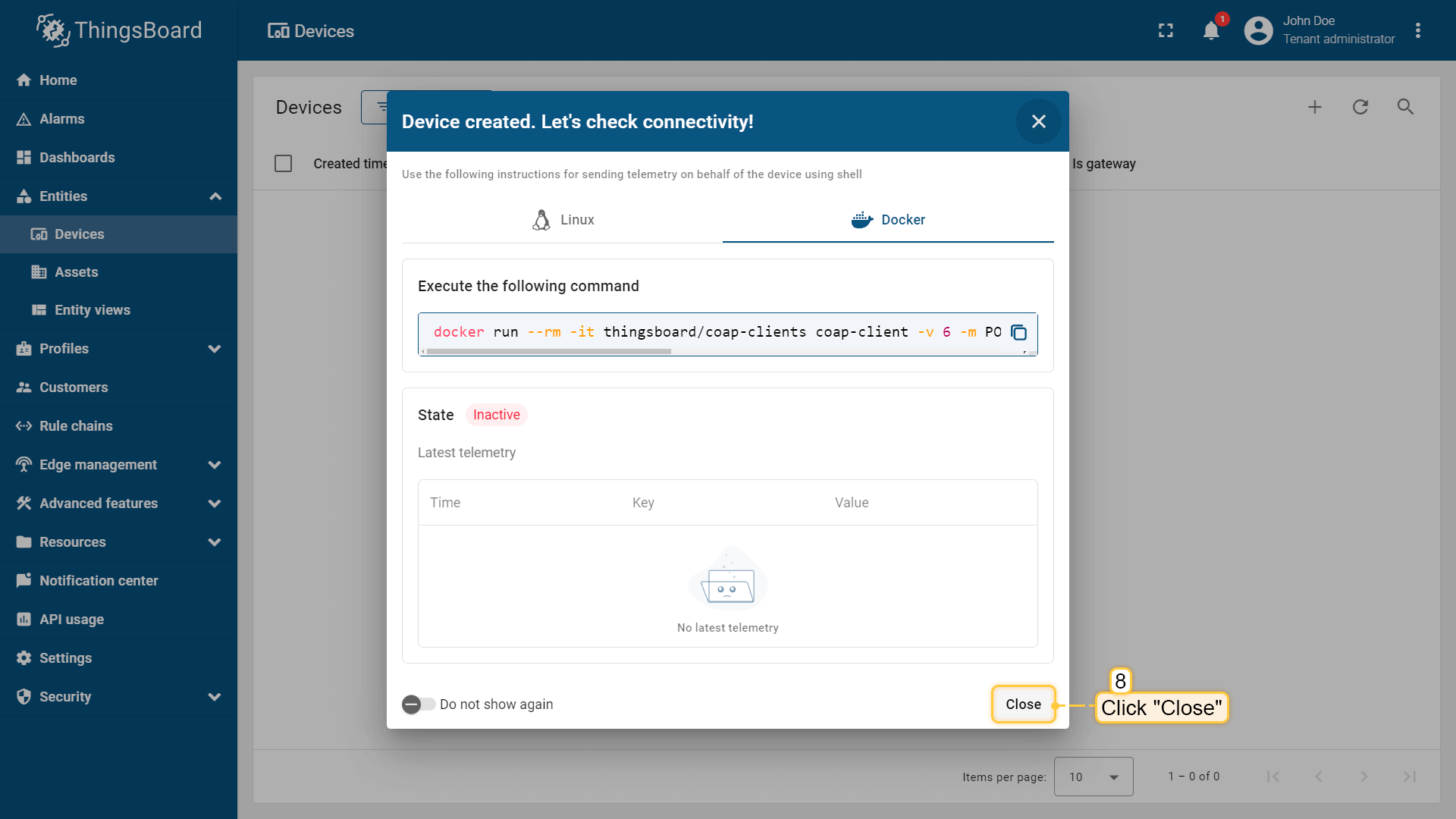将打开一个窗口,可检查设备与ThingsBoard的连接状态,此步骤为可选。关闭此窗口。