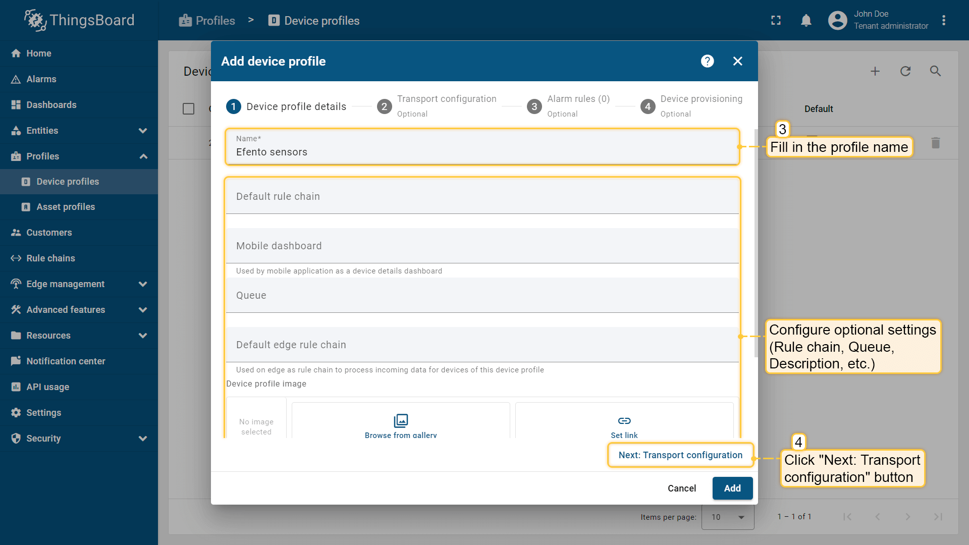 输入设备名称。在”设备配置”字段中选择刚才为Efento传感器创建的配置,然后点击”下一步:凭证”按钮。