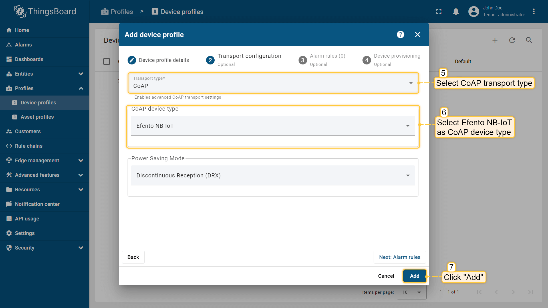 在”传输类型”下拉菜单中选择”CoAP”,在”CoAP设备类型”下拉菜单中选择”Efento NB-IoT”,点击”添加”按钮确认创建新设备配置。