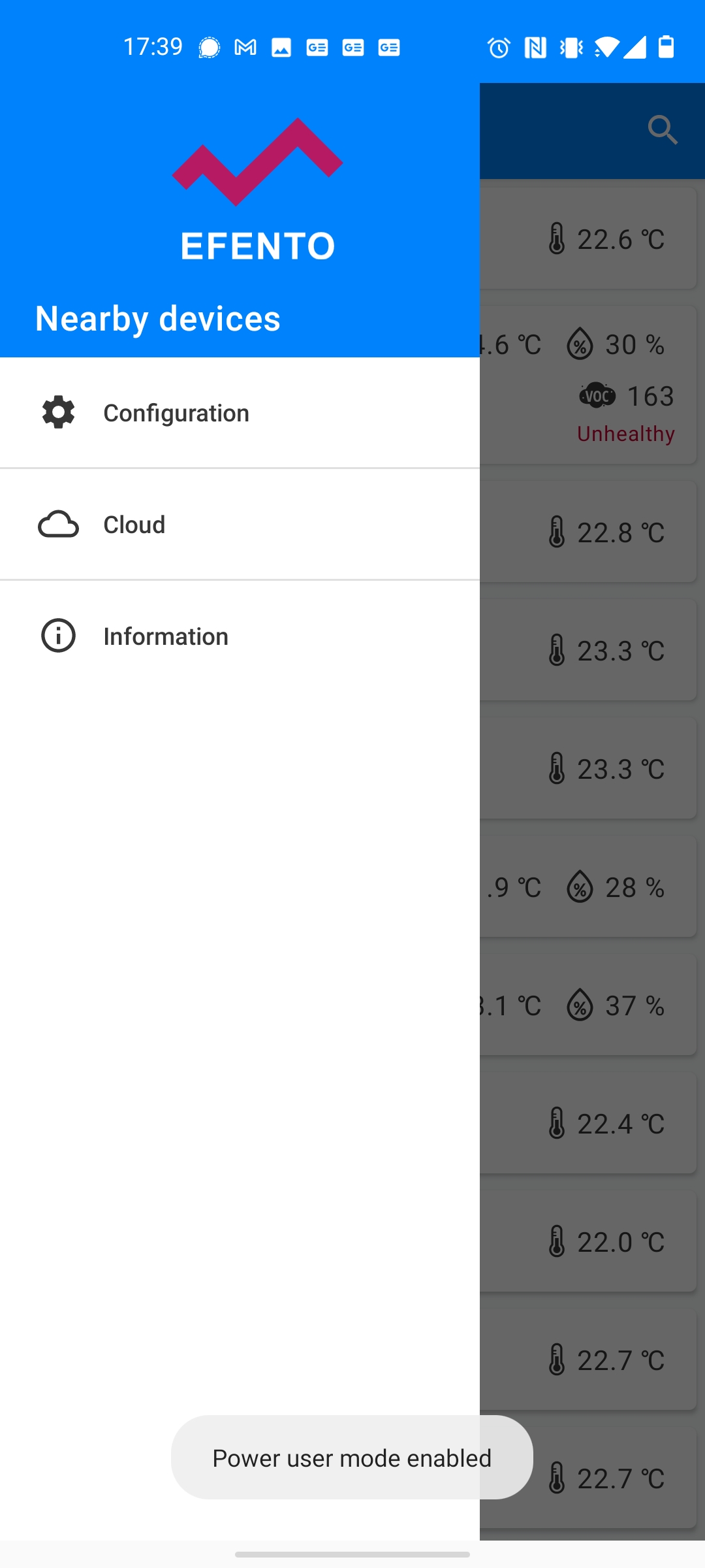 下载并安装应用后,选择”Nearby sensors”模式,解锁高级用户模式:打开应用菜单,快速连点Efento图标五次。