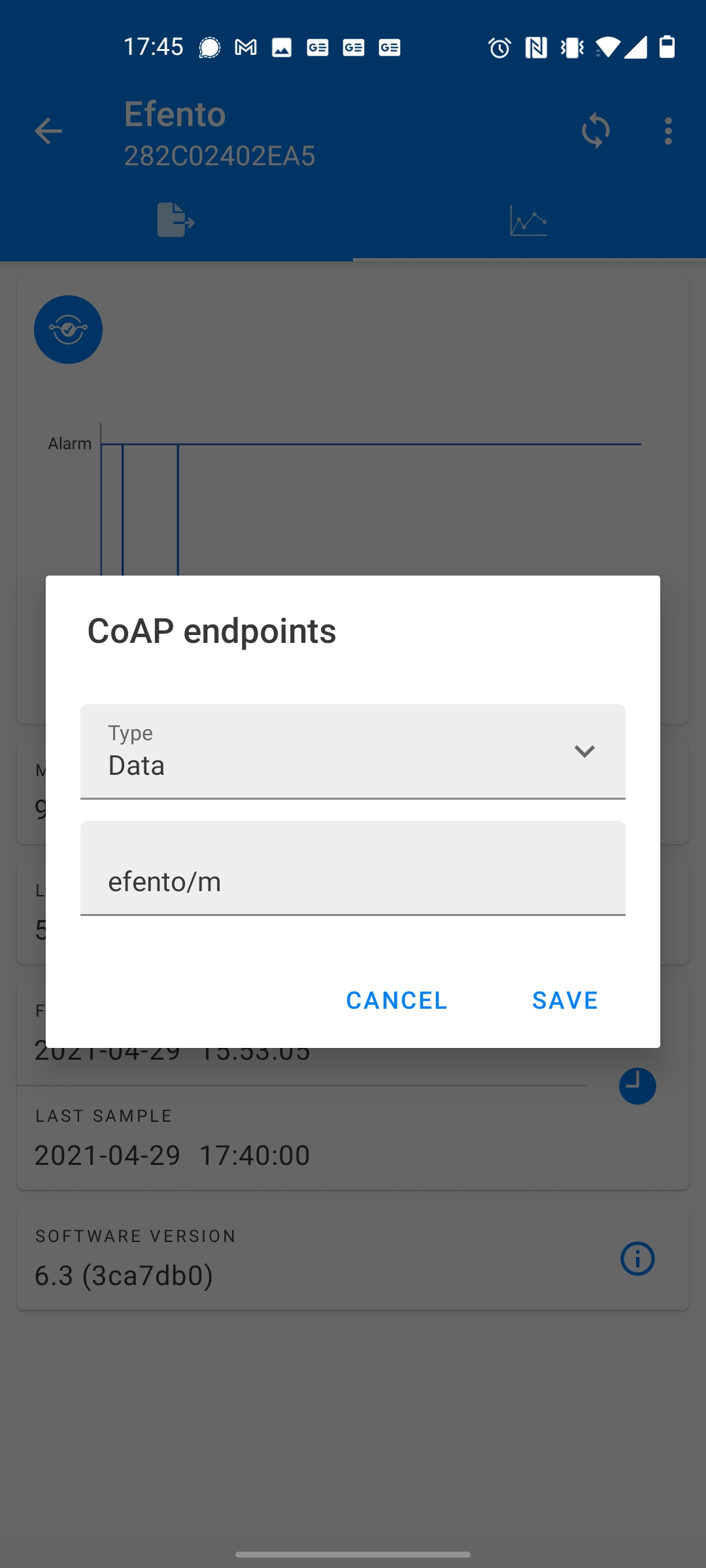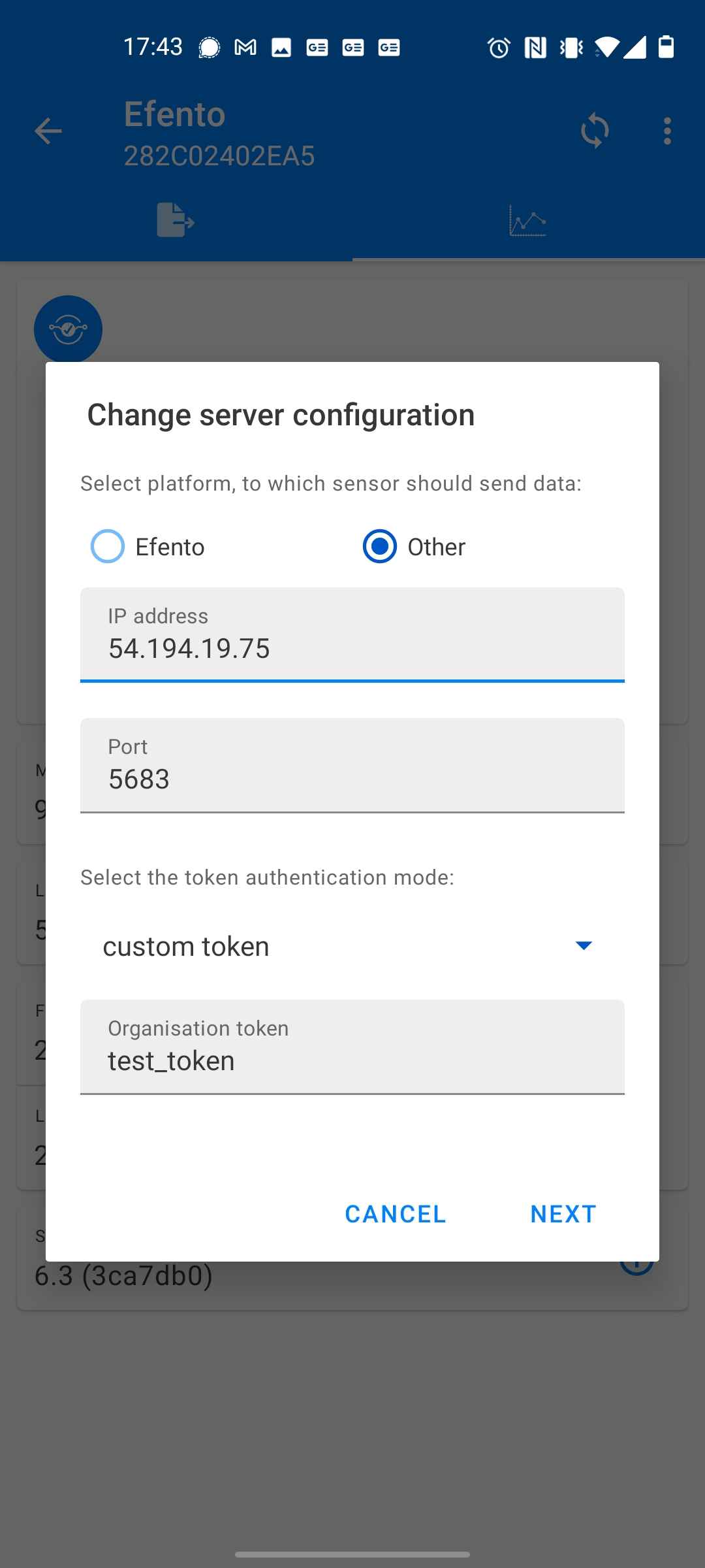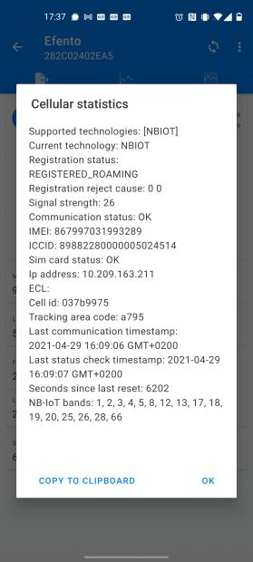 确保使用的APN允许设备连接到运行ThingsBoard实例的服务器。可在Efento移动应用中检查网络状态:连接传感器 -> 点击菜单(右上角三个点)。