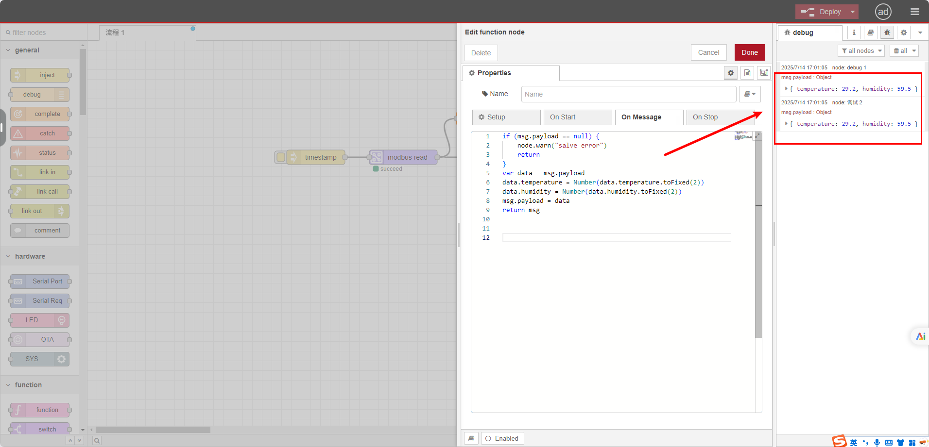 Click the inject node will show that the temperature and humidity data of the sensor are printed in the log bar on the right.