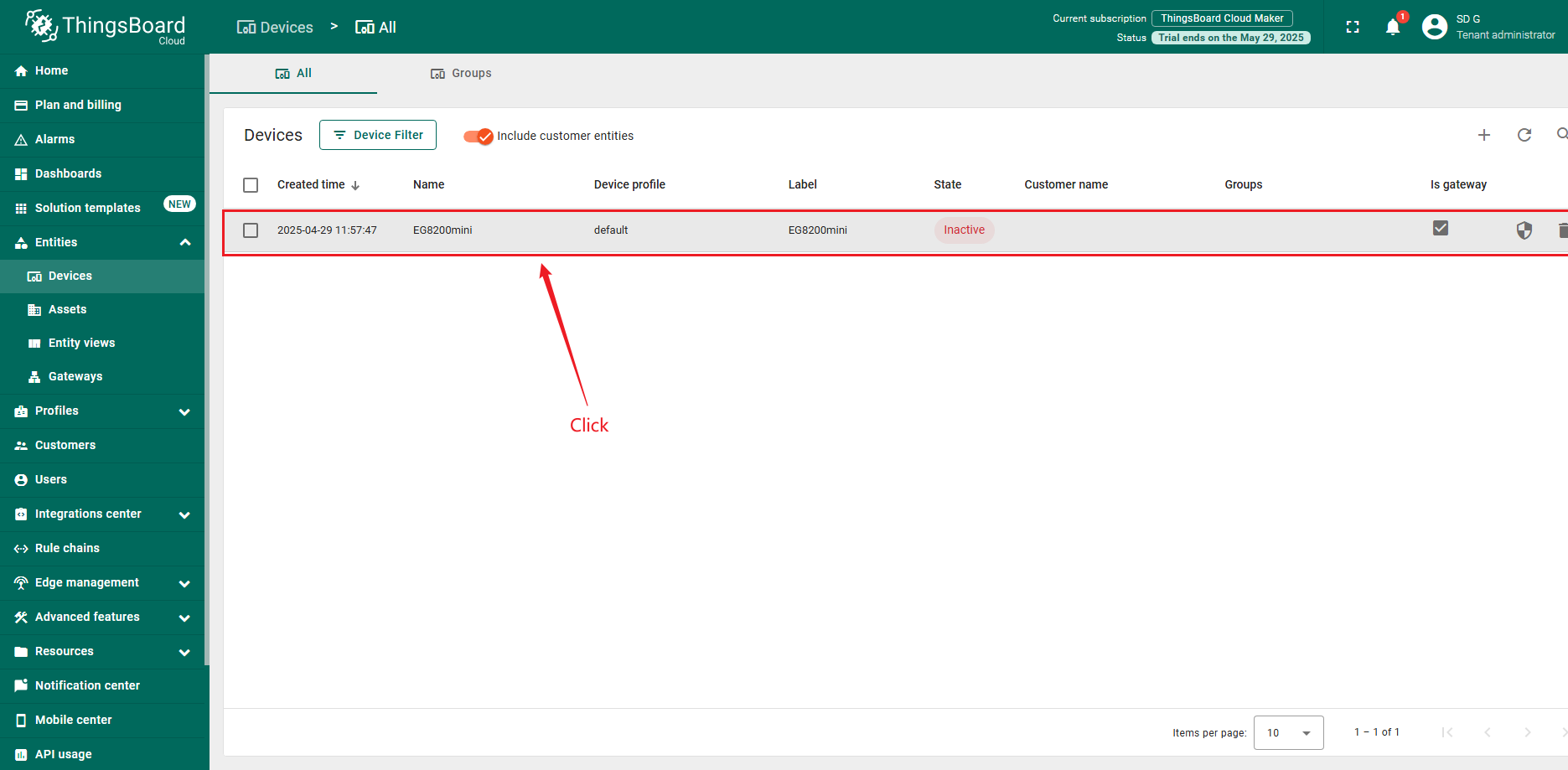 - 登录ThingsBoard实例,进入”实体”部分的”设备”页面。