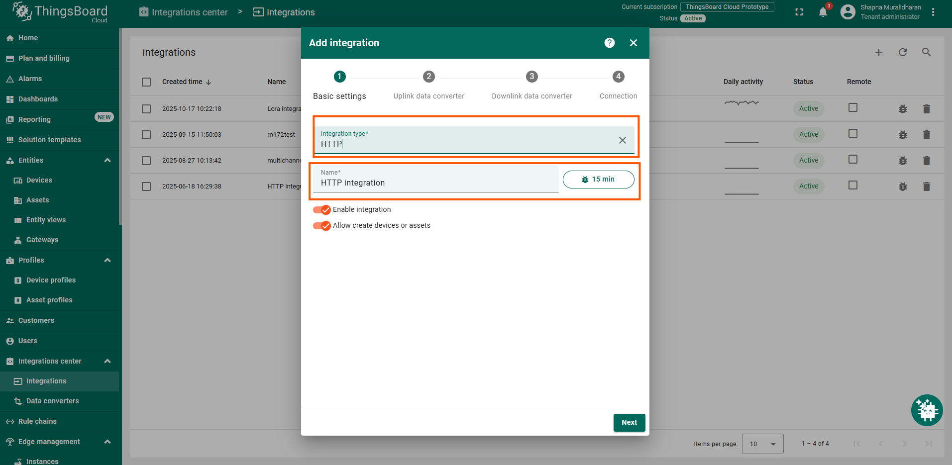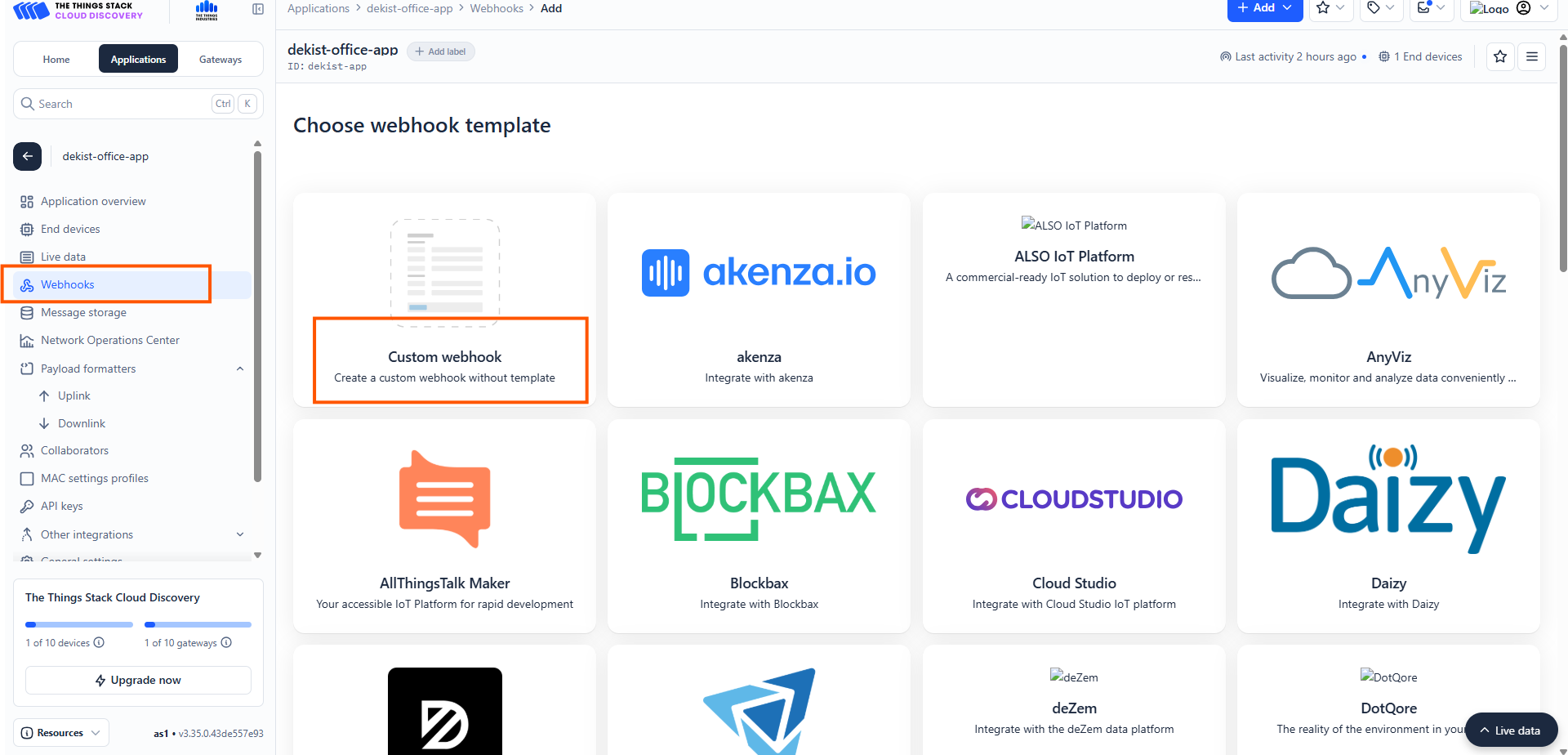 选择HTTP 集成,因为我们将通过TTS中创建的Webhook接收数据(Webhook配置将在后文说明)。