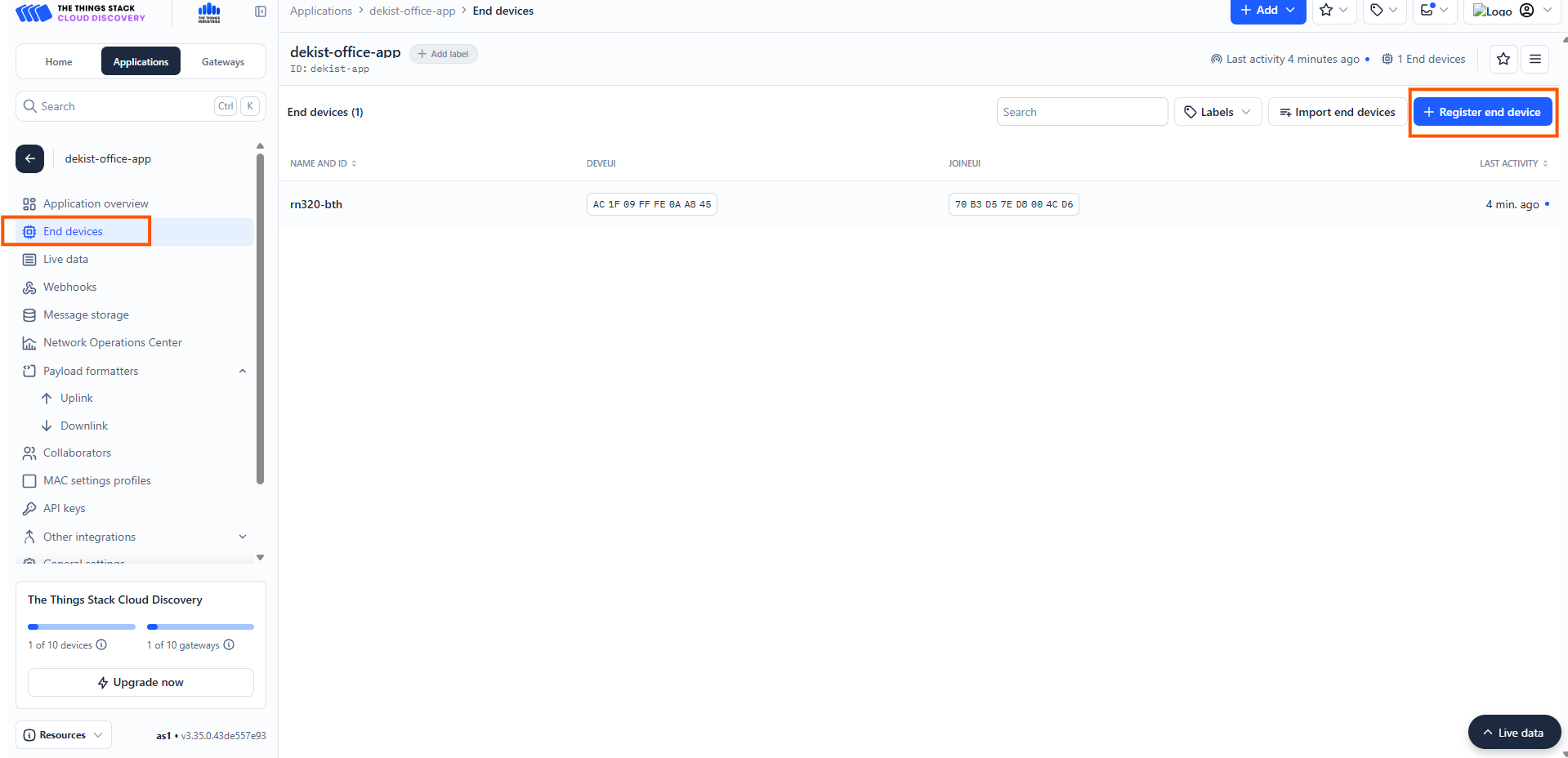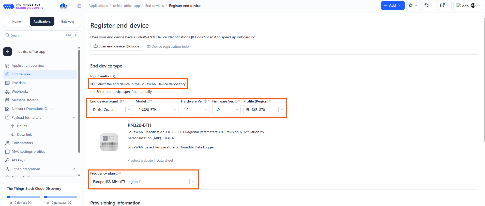 下一步是在TTS中创建终端设备。导航到End devices → Register end device 。