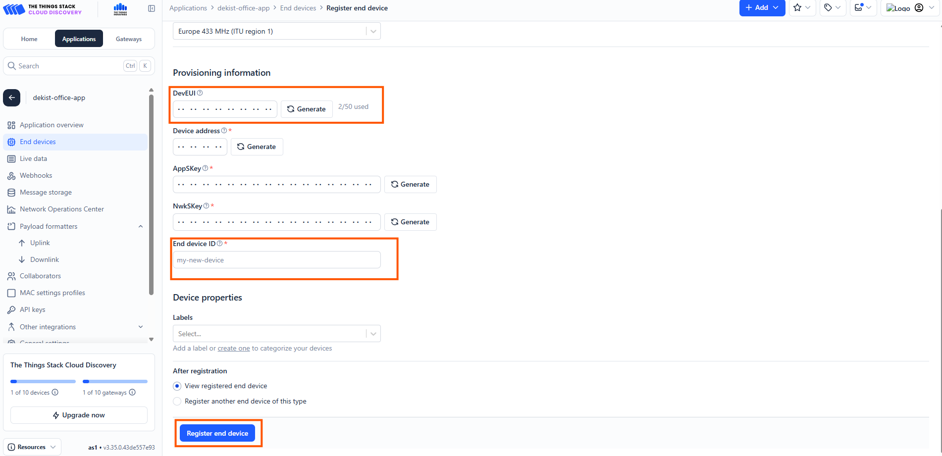 Enter the DevEUI correctly in the slot provided there. You can find DevEUI on the sticker on the side of the device. Add an End device ID in the slot given. Click Register end device to complete the end device registration.