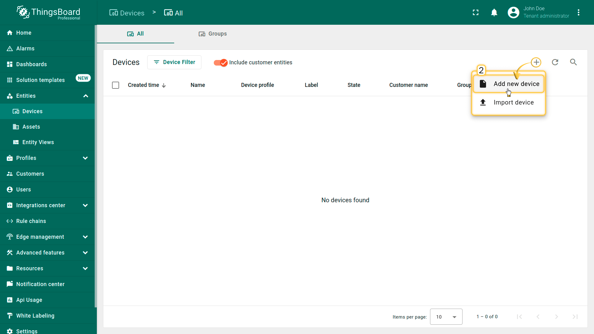 登录ThingsBoard实例并进入 实体 > 设备 页面。