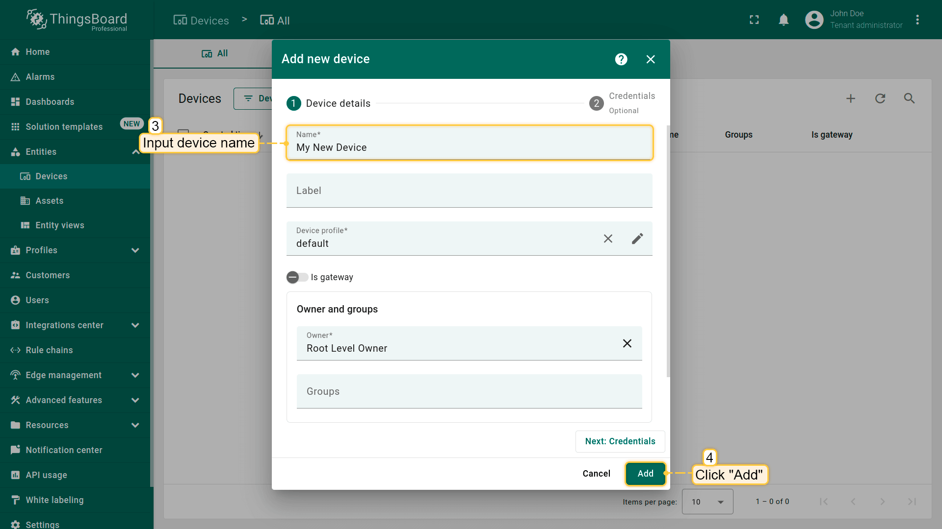 输入设备名称,例如 “My Device”。其他字段可保持默认,点击 添加 创建设备。