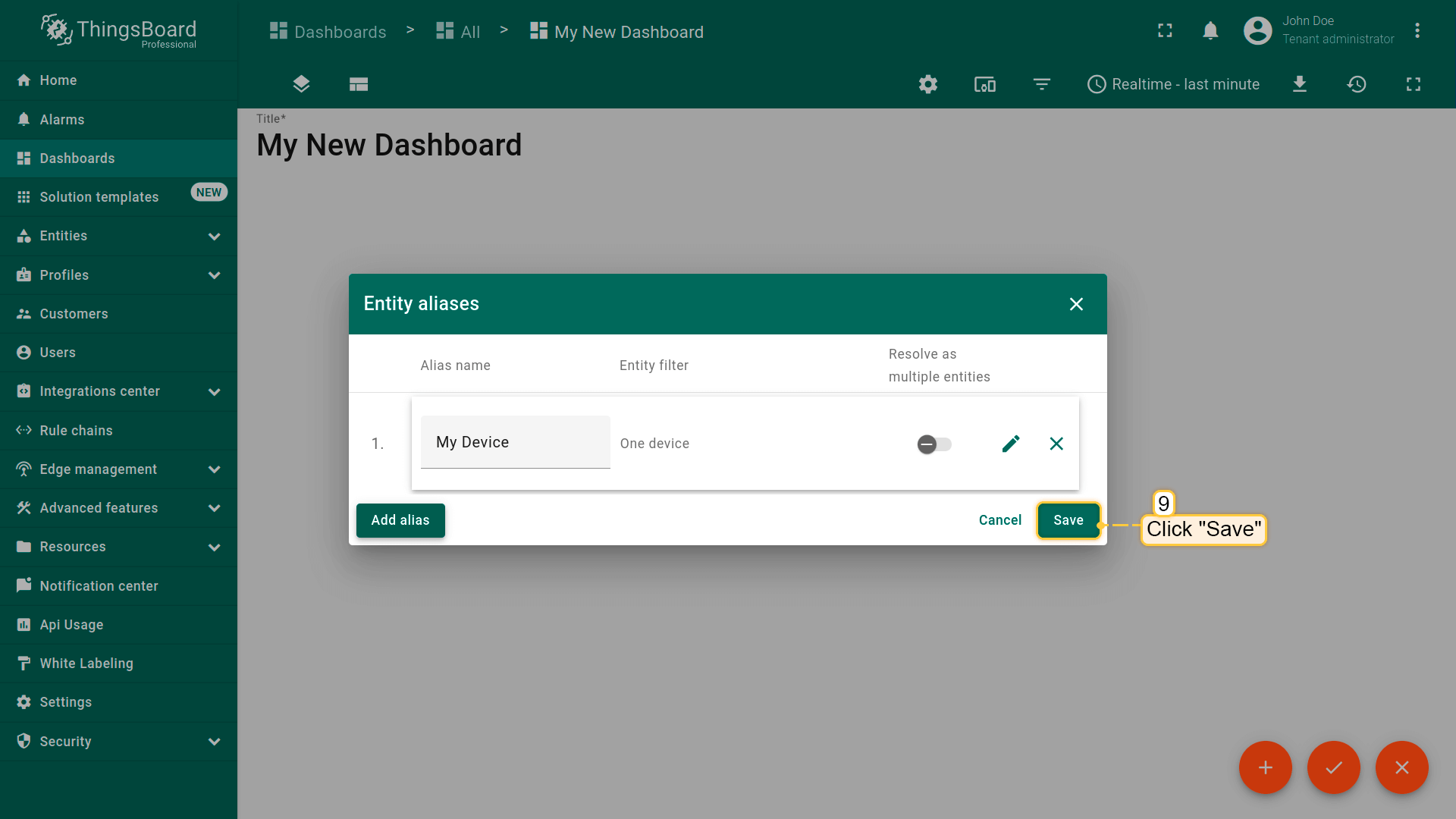 导入仪表盘您可导入 JSON 格式的仪表盘。要导入仪表盘,请进入「仪表盘」组,点击页面右上角的 「+」 按钮,选择 「导入仪表盘」。仪表盘导入窗口将弹出,系统会提示您上传 JSON 文件并点击 「导入」。 下方可找到仪表盘 JSON 文件: 导入后,我们需要为设备选择实体别名。 操作方式:点击铅笔图标并选择实体别名,选择别名「My device」并点击铅笔图标打开编辑。 然后,从下拉列表中选择名为 My device 的设备并保存实体别名。完成后即可查看设备数据。 若操作正确,您将看到以下仪表盘: