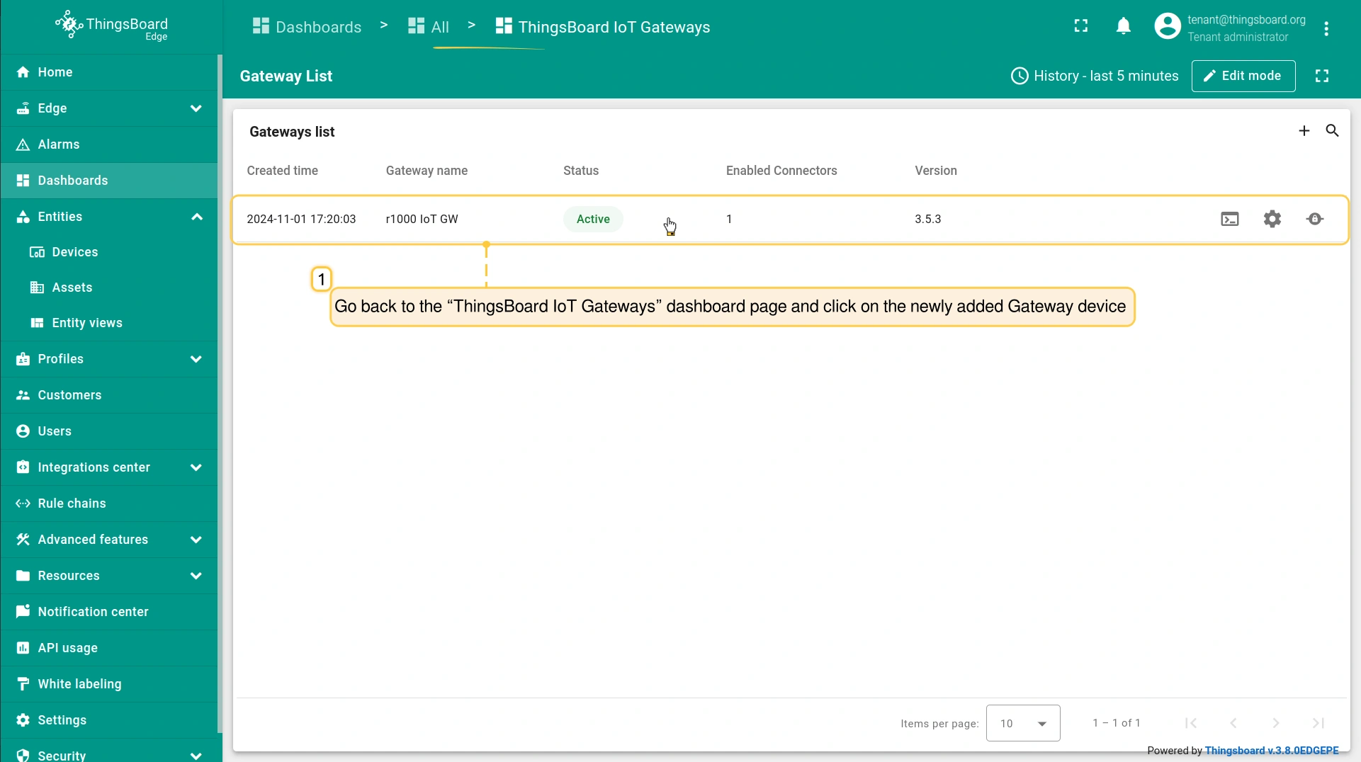 打开 Edge 实例,进入 Dashboards 部分,打开 「ThingsBoard IoT Gateways」 仪表板。