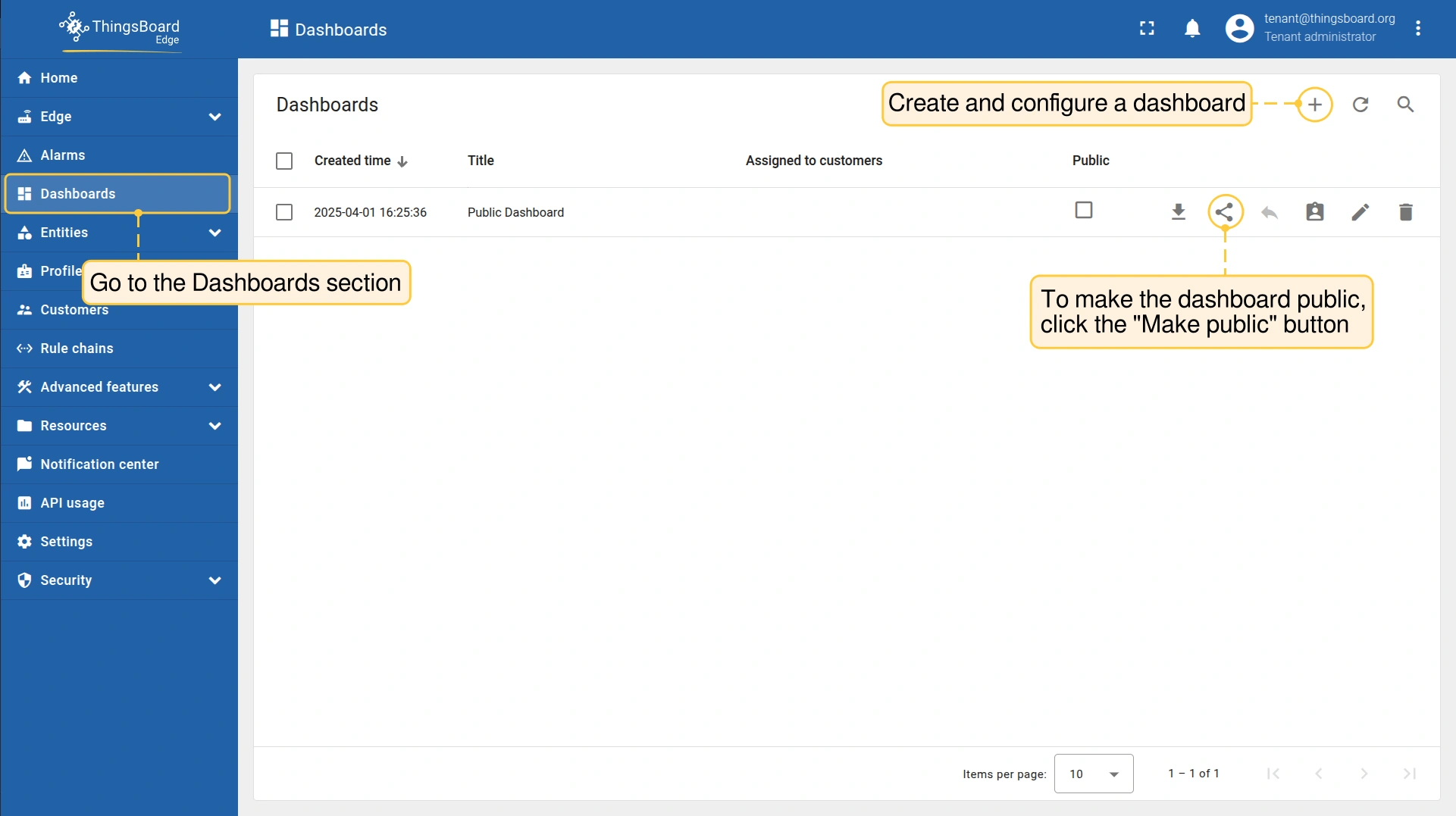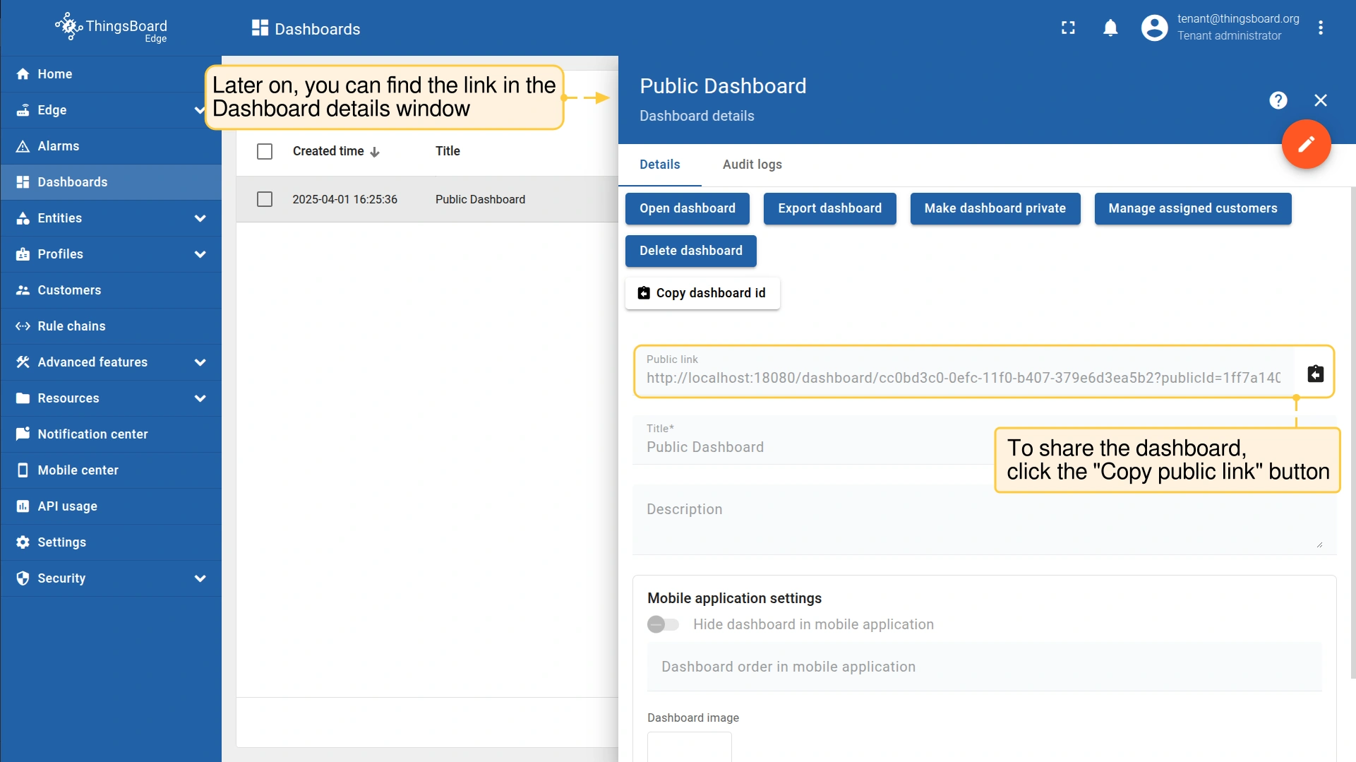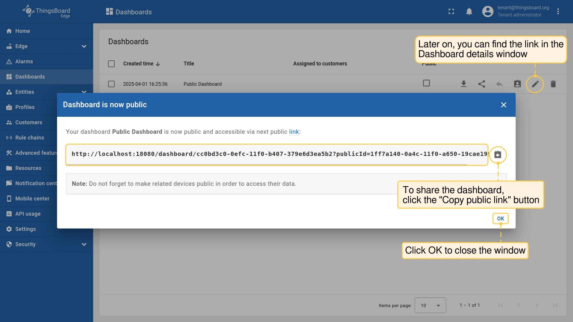 在 ThingsBoard Edge 中,公共仪表板 与 ThingsBoard Server 上的工作方式相同。