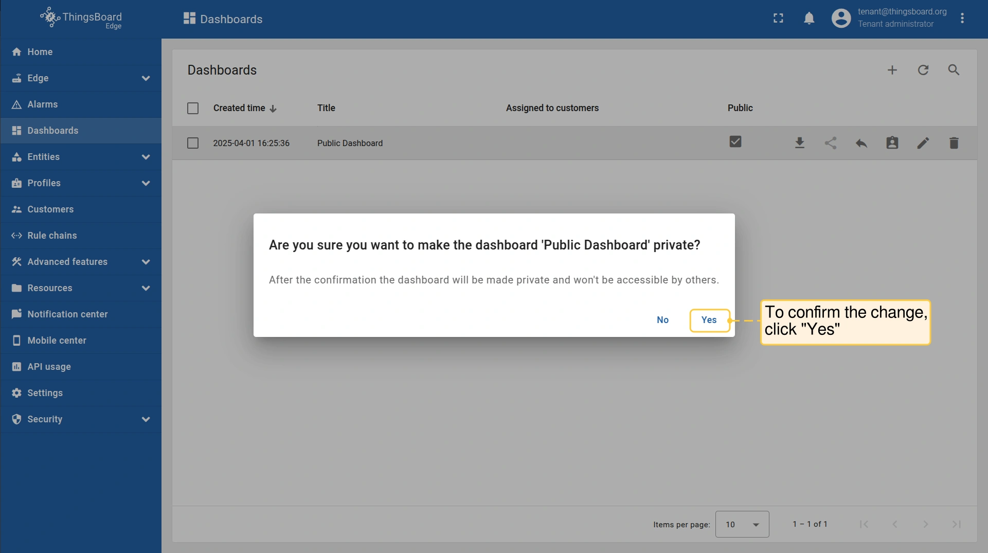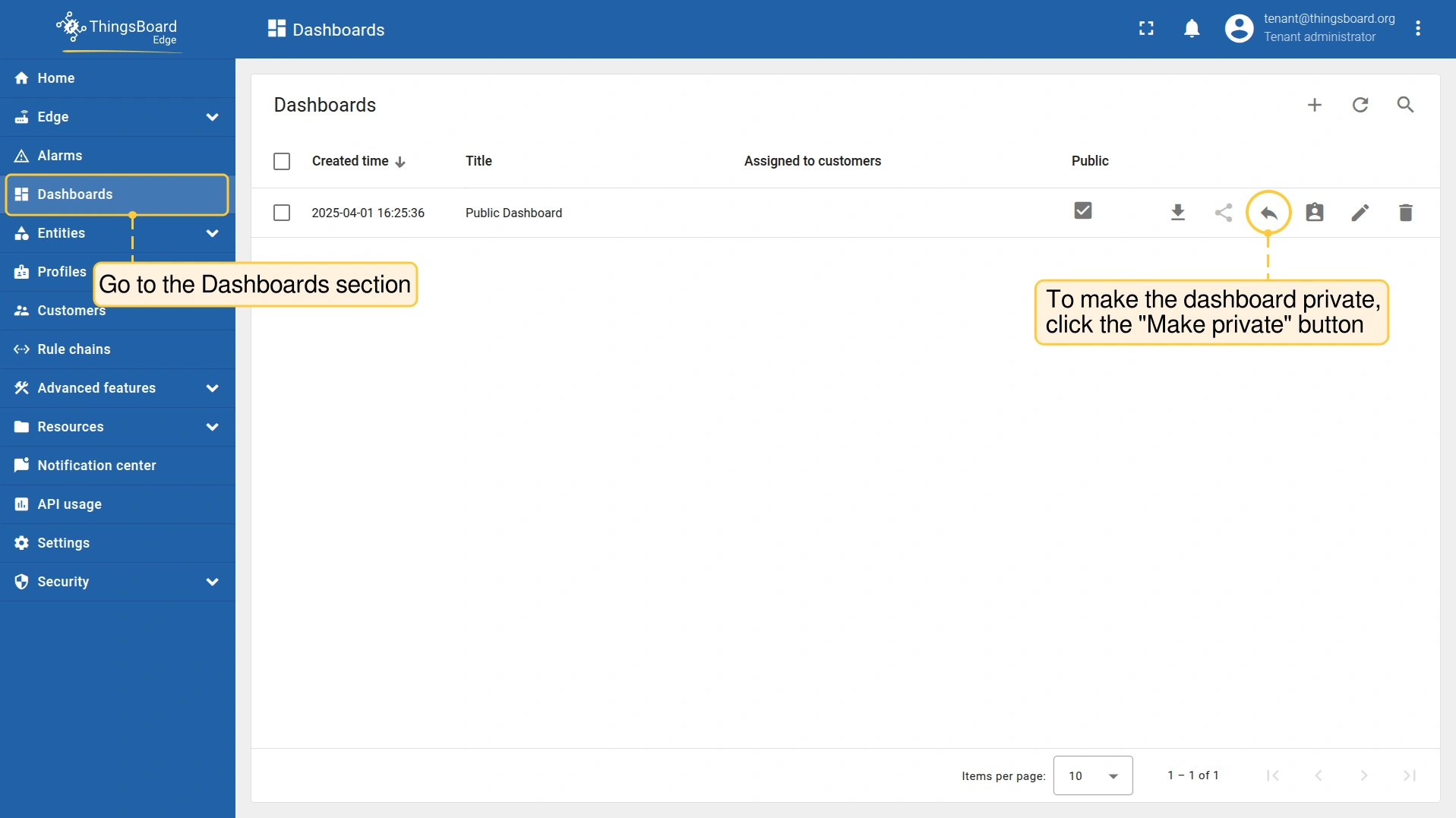 - 登录ThingsBoard Edge,进入仪表板区域。要使仪表板设为私有,点击"设为私有"按钮。