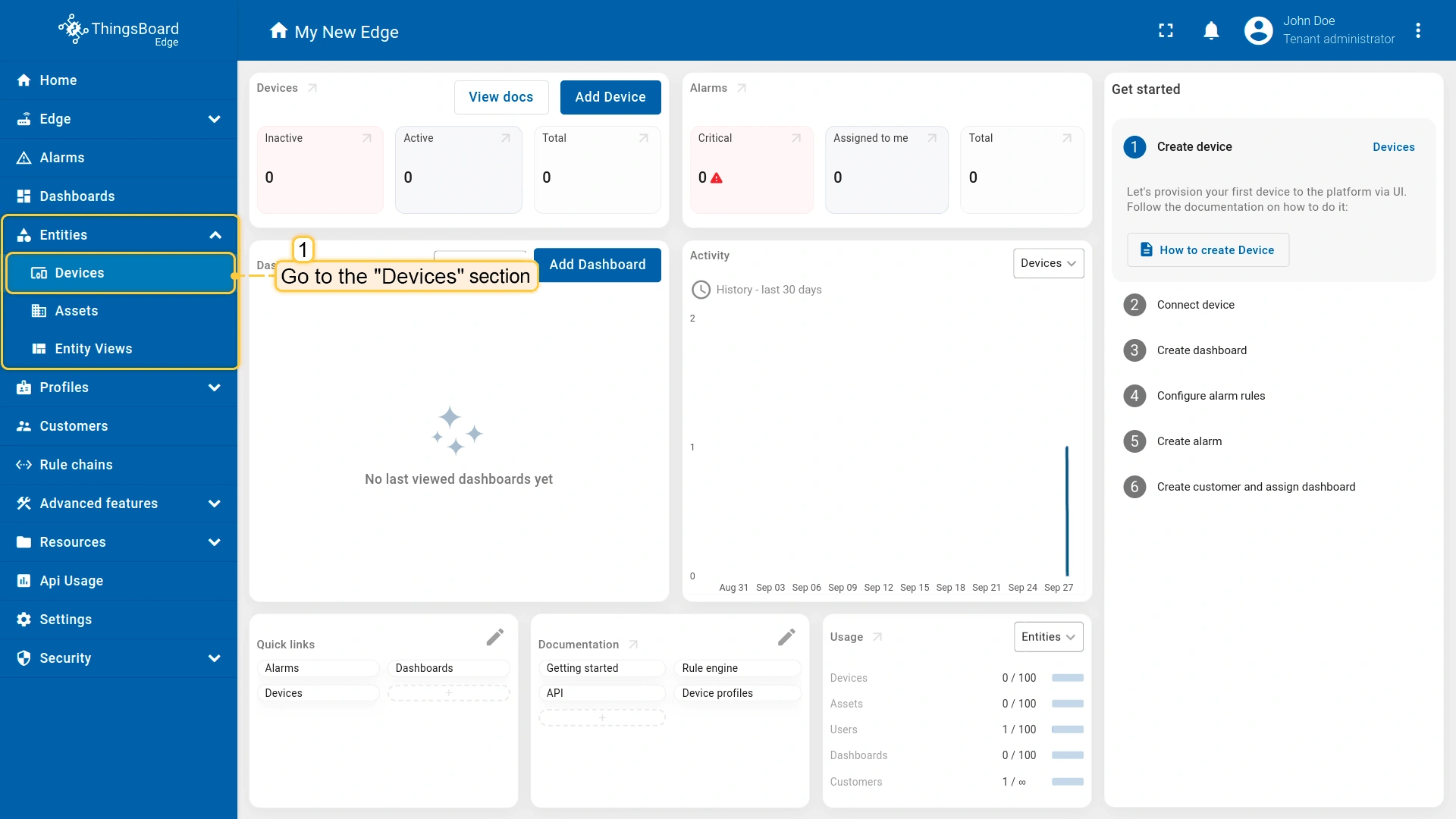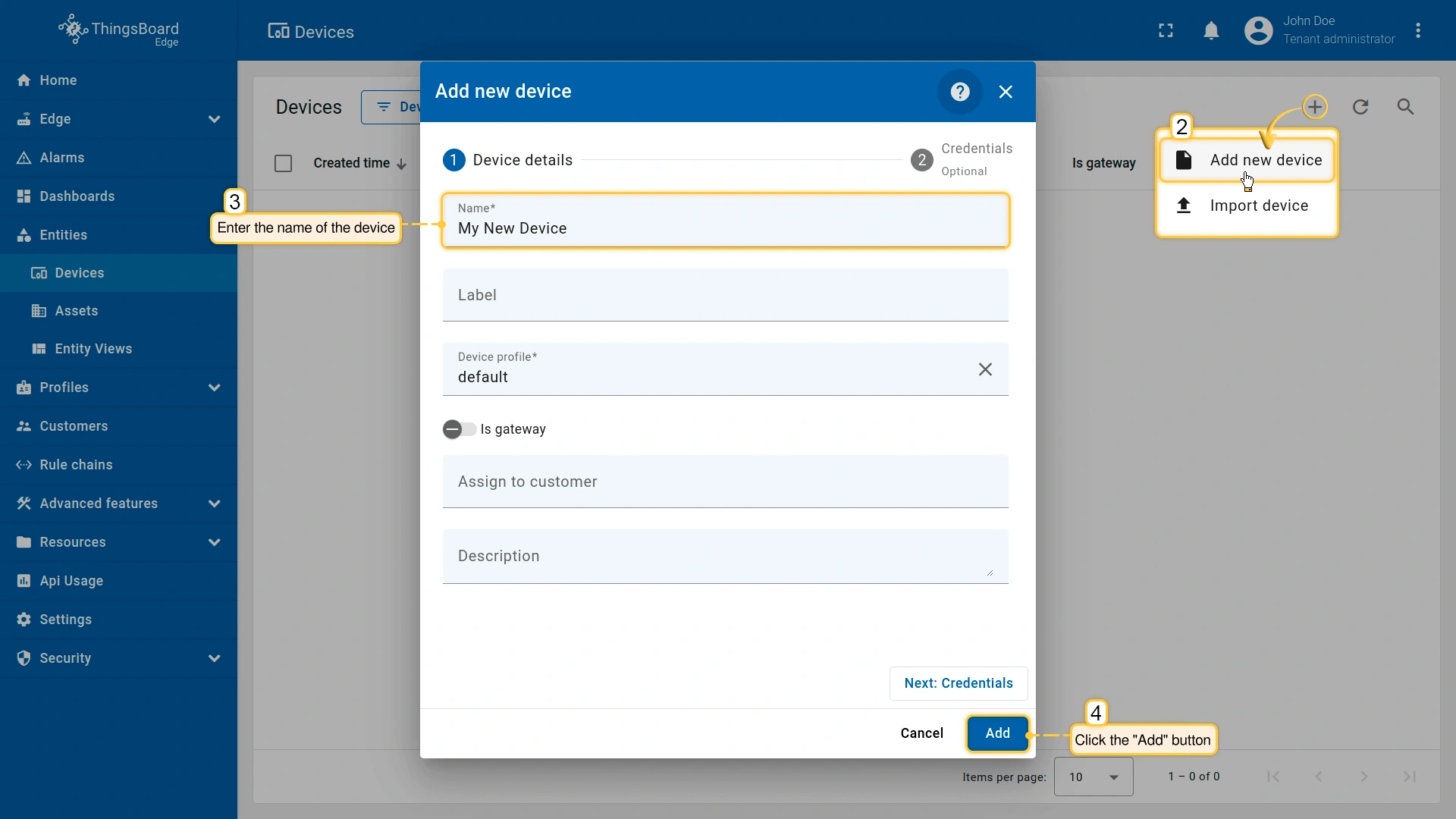 要在Edge上添加新设备,请登录您的ThingsBoard Edge实例(EDGE_URL)并按以下步骤操作: